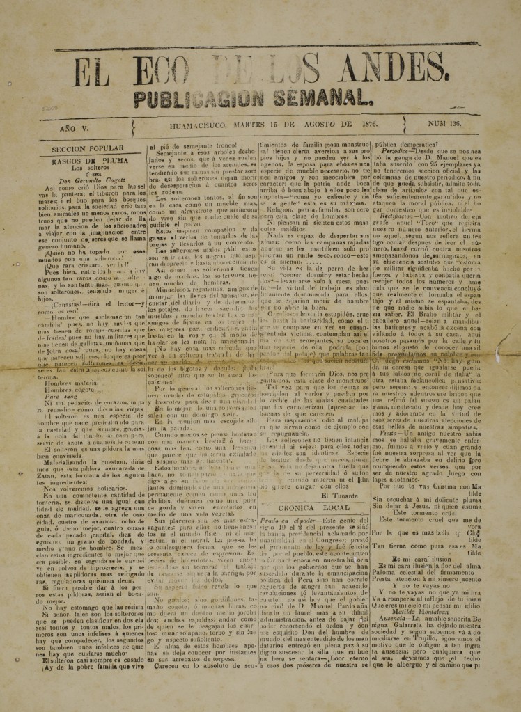 Publicación semanal de corte político y literario, impreso en Huamachuco (La Libertad) por Cipriano Sociago. Jorge Zevallos Quiñones (1949, p. 39) nombra la existencia de posibles ejemplares cerca de 1879, mientras que Mariano Felipe Paz Soldán (1879, p. 24) lo incluye en su Biblioteca Peruana, pero sin señalar año de publicación. El ejemplar digitalizado por la Biblioteca Nacional del Perú (año V, nro. 136, 15 de agosto de 1876) resalta por la aparición, en la sección popular, de un joven Tunante (Abelardo Gamarra), además de columnas dedicadas a la toma de mando de Mariano Ignacio Prado y el reglamento de la Junta Parroquial de Cofradías de Mollepata.