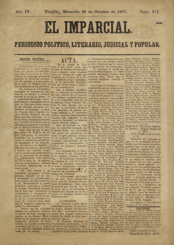 “Periódico político, literario, judicial y popular” que veía la luz cada miércoles y sábado en la ciudad de Trujillo, aparecido entre 1863 (según testimonio de Mariano Felipe Paz Soldán, 1879, p. 84) y al menos 1881 (según existencias en la Biblioteca Nacional del Perú). Bajo un formato de escritura denso y sobrecargado, El Imparcial servía de vocero político de la causa rebelde en el norte peruano frente al gobierno de Juan Antonio Pezet, en una clara protesta contra la ocupación española de las islas Chincha (iniciada el 14 de abril de 1864). En sus páginas se exponían actas de reuniones de diversos personajes a favor de la retoma de la dignidad del país. Por ello, la sección política es la parte más extensa, aunque también contaba con avisos públicos locales, una sección jurídica destinada a exponer casos locales en su mayoría de disputas, querellas o avisos legales, entre otros. La sección internacional era intermitente y aparece en ocasiones dentro de las páginas del bisemanario como un acápite pequeño, pues contaban con aliados estratégicos en Guayaquil, Loja, Quito y Panamá. A su vez, El imparcial contaba con colaboradores y aliados en casi todo el país destacando, Lima, Callao, Ica, Ayacucho, Cusco, Arequipa, Huaraz, Piura, Cajamarca, Chiclayo, entre otros.