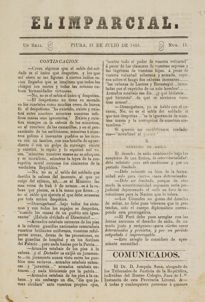Periódico publicado en Piura en 1855 en la imprenta de Manuel Estevan Rios a coste de un real por entrega. El ejemplar digitalizado por la Biblioteca Nacional del Perú (nro. 11, 21 de julio de 1855) cuenta con una sección que sirve de continuación a un escrito del número anterior sobre el despotismo, donde se explaya en la bajeza de la clase política. Intuimos que el escrito estaba dirigido hacia los cambios políticos que se pretendían aplicar (y se aplicaron) durante el gobierno provisorio de Ramón Castilla, bajo el cual ya se había instaurado la Convención Nacional del Perú con la finalidad de, en 1856, promulgar una nueva constitución. El ejemplar también cuenta con una espléndida caricatura satírica a cara completa, representando las pugnas de las clases sociales de la época bajo el señalado despotismo.