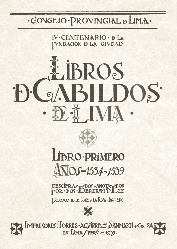 En conmemoración del IV centenario de la fundación de la ciudad de Lima, el Concejo Provincial de Lima impulsó la transcripción y estudio de los «Libros de Cabildos de Lima» correspondientes a los años 1534 a 1639 (Libros I, III-XXIII). El trabajo fue desplegado entre los años 1935 y 1963, contando con la participación de Bertram T. Lee, Carlos A. Romero, Domingo Angulo, Horacio H. Urteaga, Juan Bromley, José de la Riva-Agüero y Osma, Sophy E. Schofield, Emilio Harth-Terré, entre otros. Con ello se superó el trabajo realizado por Enrique Torres Saldamando entre 1888 y 1900, quien en transcribió el Libro Primero (1534-1539), labor que José de la Riva Agüero y Osma calificó como «plagada de errores».