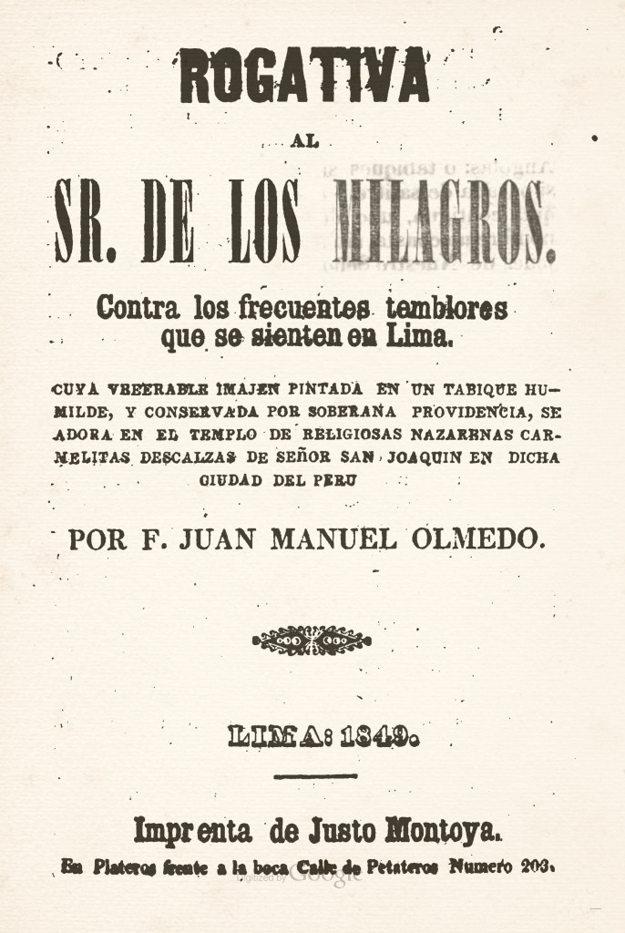 Olmedo, Juan Manuel (1849). Rogativa al Sr. de los Milagros: Contra los temblores que se sienten en Lima. Lima: Imprenta de Justo Montoya.