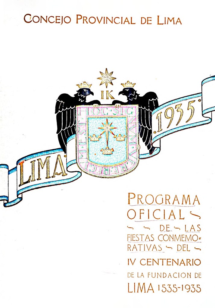 Programa oficial de las actuaciones, ceremonias y fiestas conmemorativas con motivo del IV Centenario de la Fundación de la Ciudad de Lima (1535-1935), publicado por encargo del Concejo Provincial de Lima, siendo Presidente de la Comisión Ejecutiva de la Celebración el IV Centenario de la Fundación de Lima, Diómedes Arias-Schreiber; Alcalde de Lima, Luis Gallo Porras y Presidente de la República, Óscar R. Benavides.