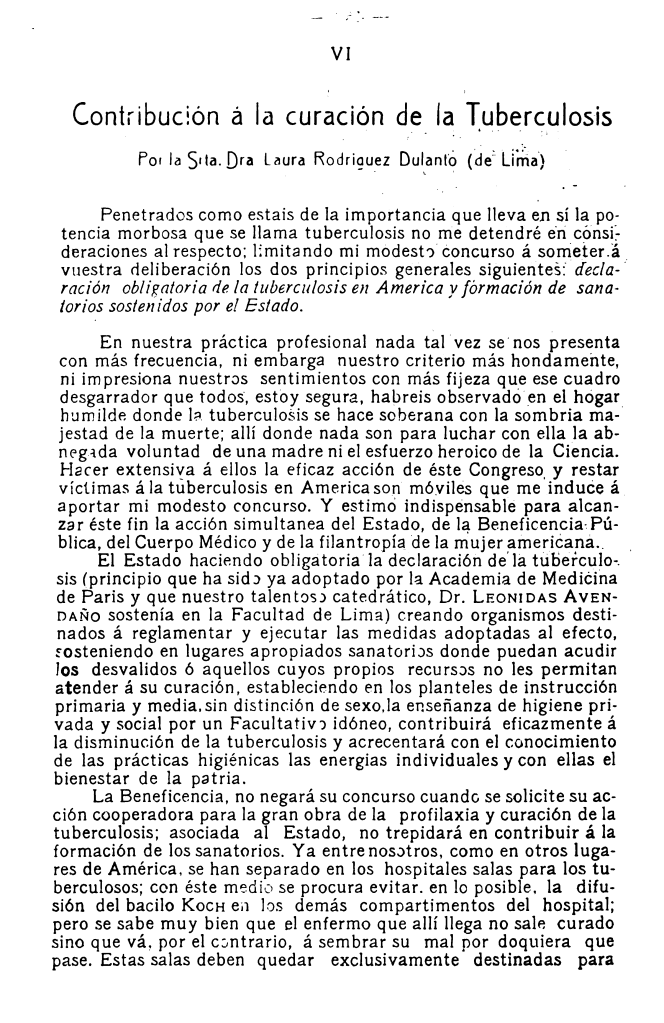 Ponencia ofrecida por Laura Esther Rodríguez Dulanto en el Quinto Congreso Médico Latino Americano (Sexto Panamericano), organizado en Lima entre el 9 y 16 de noviembre de 1913. Dicha ponencia se refiere a los principios generales de la tuberculosis, como la declaración obligatoria de la tuberculosis en América y a la conformación de sanatorios apoyados por el Estado. Para esta época, la tuberculosis fue considerada como una enfermedad de muerte sombría. En efecto, la autora se refiere a 3 contribuciones para hacer frente a esta enfermedad: la acción del Estado, el apoyo de la Beneficencia Pública y el Cuerpo Médico en aspectos de establecimientos y tratamiento y a la filantropía de la mujer americana.