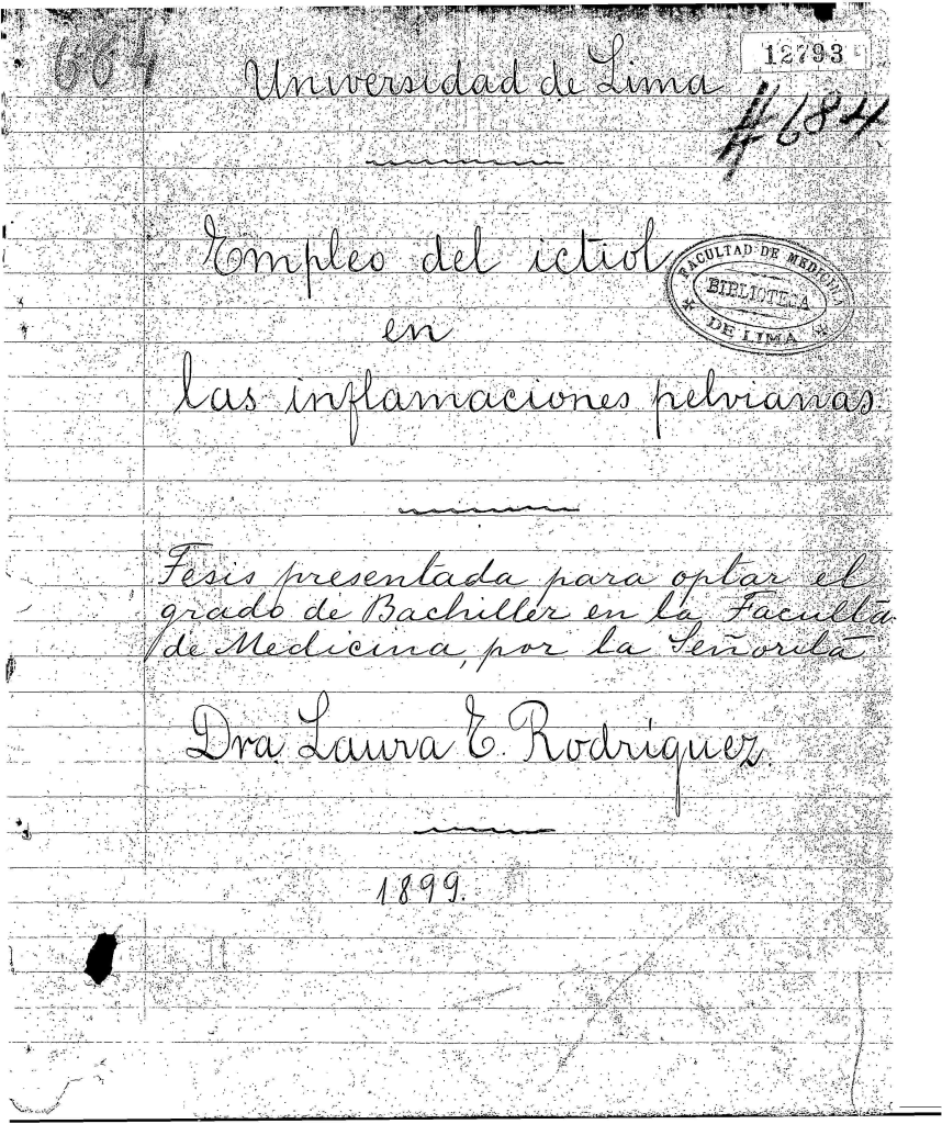 Rodríguez Dulanto, L. E. (1899). Empleo del ictiol en las inflamaciones pelvianas [Tesis para optar el grado de Bachiller en Medicina]. Lima: Facultad de Medicina de la Universidad Mayor de San Marcos. [Manuscrito]