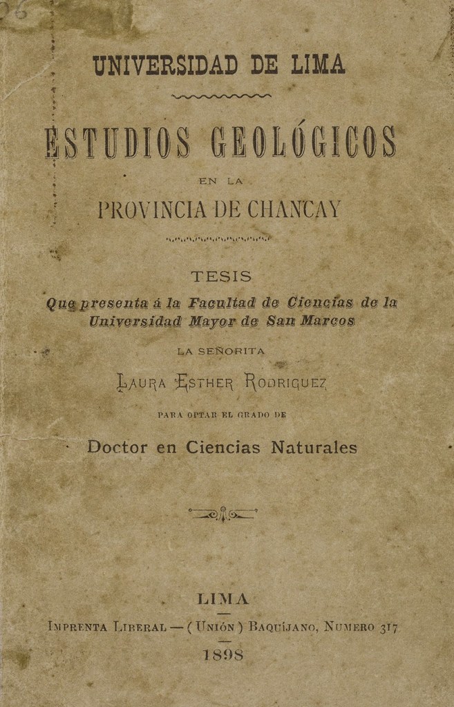 Rodríguez Dulanto, L. E. (1898). Estudios geológicos en la provincia de Chancay [Tesis para optar el grado de Doctor en Ciencias por la Facultad de Ciencias de la Universidad Mayor de San Marcos]. Lima: Imprenta Liberal.