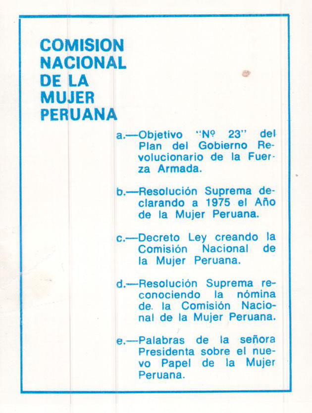 Comisión Nacional de la Mujer Peruana (1975). Comisión Nacional de la Mujer Peruana. Lima: Comisión Nacional de la Mujer Peruana.