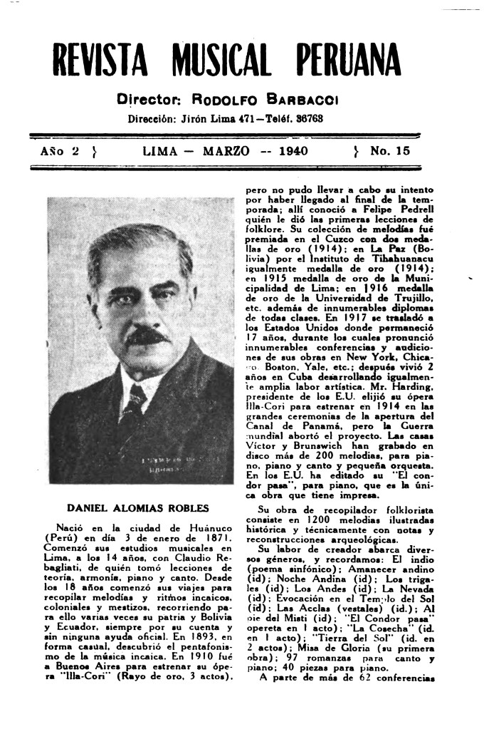 Entre los principales artículos biográficos se encuentran los correspondientes a Theo Buchwald, Vicente Stea, Andrés Sas, Roldolfo Holzmann, Theodoro Valcárcel, Enrique Fava Ninci, Federico Gerdes, Pablo Chávez Aguilar, José María del Valle Riestra, Daniel Alomía Robles, Claudio Rebagliati, Ernesto López Mindreau, Roberto Carpio Valdés, Luis Pacheco Céspedes, Raoul de Verneuil, Luis Dunker Lavalle, José Bernardo Alzedo y el propio Rodolfo Barbacci. También se tratan los argentinos Roberto García Morillo, Carlos Suffern, Luis R. Sammartino, José Torres Bertucci, Pedro Valenti Costa, Celia Torrá y Ernesto de la Guardia. Es de destacar una entrevista con el pianista chileno Claudio Arrau durante su juventud.