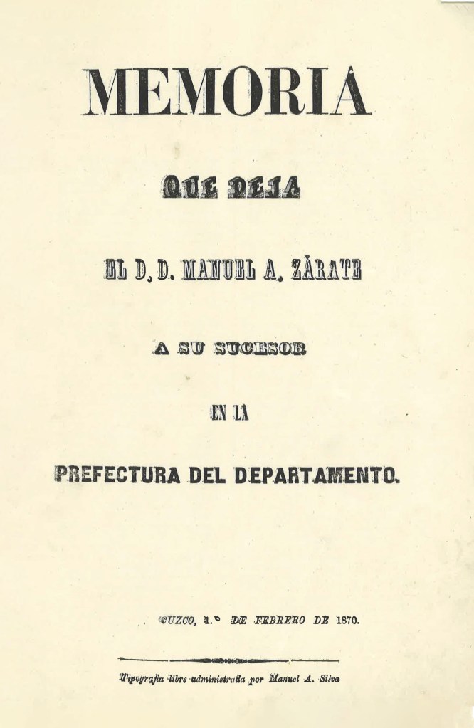 - Zárate, M. (1870). Memoria que deja el D. D. Manuel A. Zárate a su sucesor en al Prefectura del Departamento. Cuzco: Tipografía Libre administrada por Manuel A. Silva.