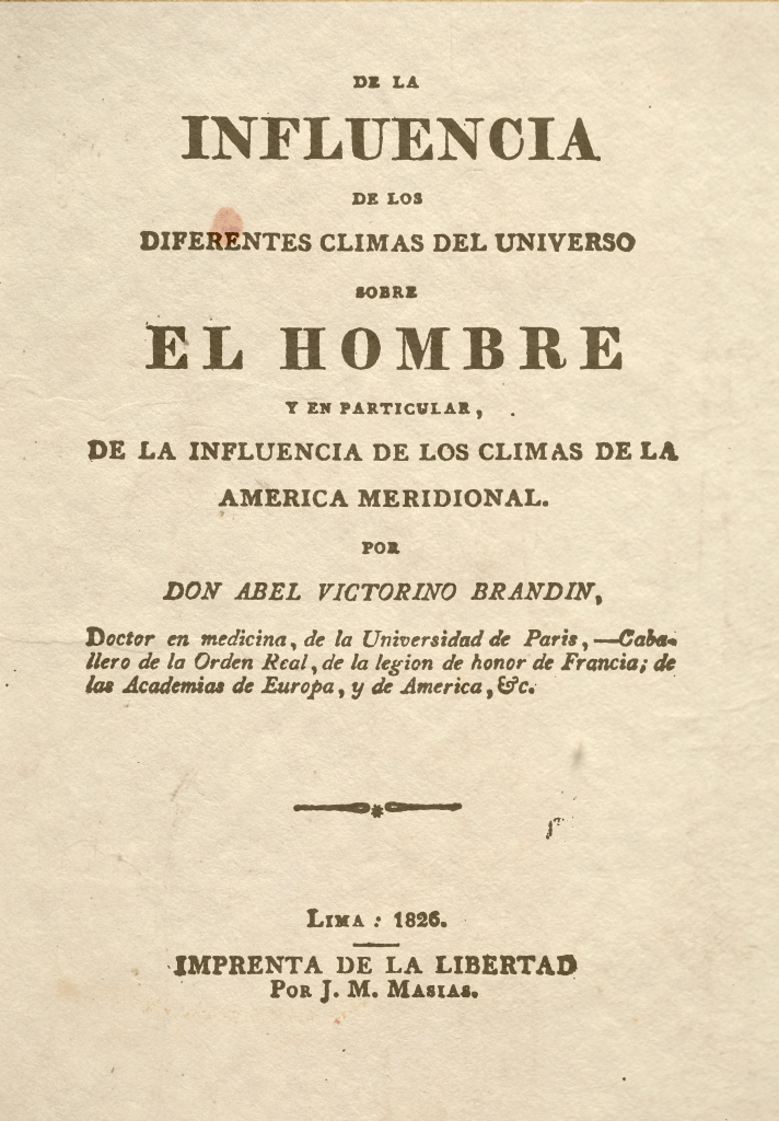 - Brandin, A. V. (1826). De la influencia de los diferentes climas del universo sobre el hombre y en particular, de la influencia de los climas de la América meridional. Lima: Imprenta de la Libertad.