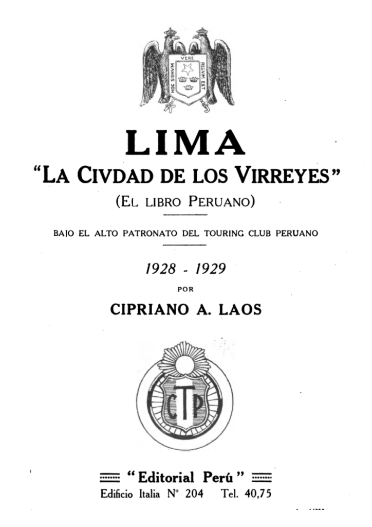 Laos, Cipriano A. (1927). Lima, «La Ciudad de los Virreyes» (El Libro Peruano): 1928-1929. Lima: Editorial Perú.