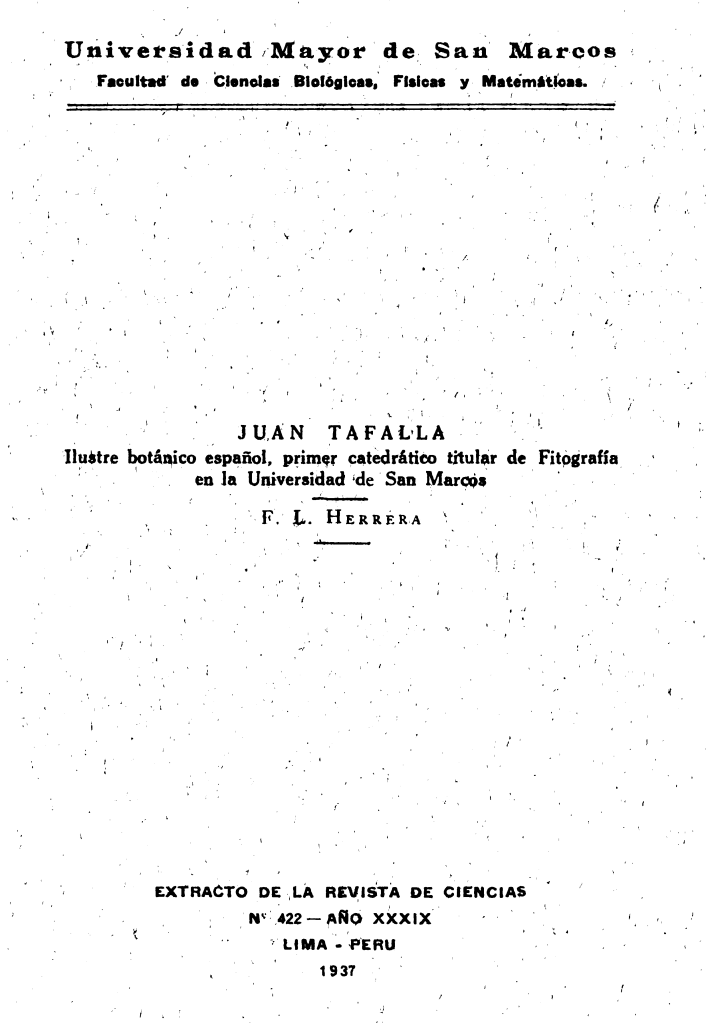 Editado por la Facultad de Ciencias Biológicas, Físicas y Matemáticas de la Universidad Mayor de San Marcos y publicado originalmente en la Revista de Ciencias, en 1937 apareció un interesante folleto que recorre la vida y obra de Juan Tafalla, destacado botánico español con especial importancia para la historia de la botánica y de la ciencia americanas, asentado en Perú desde el año 1778 por intermedio de la expedición científica enviada por el gobierno de Carlos III de España.