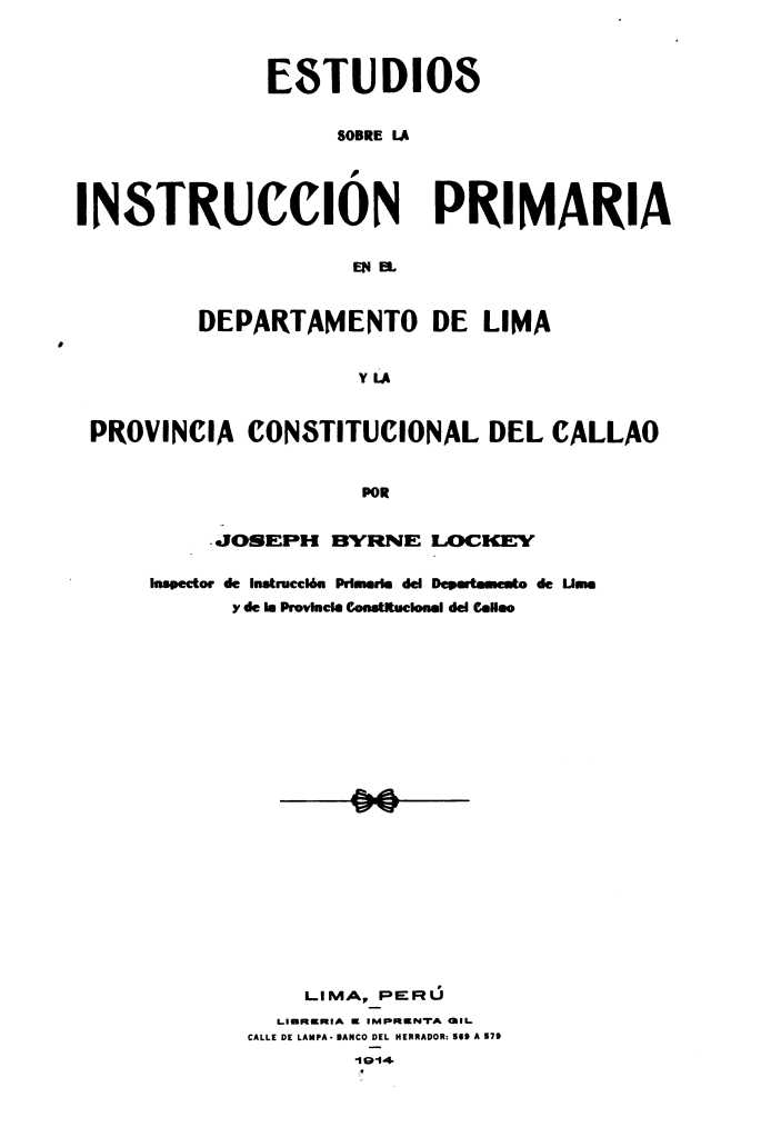 Es en este contexto de cambios que aparece Estudios sobre la instrucción primaria en el departamento de Lima y la provincia constitucional del Callao (Lima, 1914). Su autor fue el profesor norteamericano Joseph Byrne Lockey, designado inspector departamental de instrucción pública de la república del Perú de 1909 a 1914. El texto nos aproxima a conocer la instrucción primaria en Lima y Callao durante la primera década del novecientos.