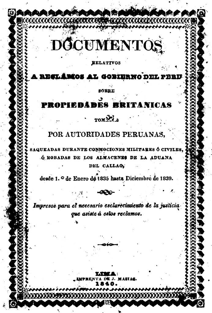 Anónimo (1840). Documentos relativos a reclamos al gobierno del Perú sobre propiedades británicas tomadas por autoridades peruanas, saqueadas durante conmociones militares o civiles, o robadas de los almacenes de la aduana del Callao, desde 1° de enero de 1835 hasta diciembre de 1839. Lima: Imprenta de J. Masías.