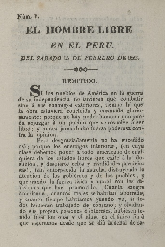 | Reseña | El Hombre Libre en el Perú fue una publicación periódica programada para publicarse quincenalmente en Lima; sin embargo, solo llegó a tener un número del 15 de febrero de 1823, además de su prospecto. En sus páginas intentó comentar la coyuntura política nacional durante los primeros años de la independencia, manifestándose en defensa de la libertad alcanzada con la proclamación de la misma. Sus editores manifiestaron su interés por contribuir al país con su publicación, recordando el aporte de Lima, que con “una sola idea pudo contribuir a la felicidad de la nación” (El Hombre Libre en el Perú, 1823: nro. 1, p. 8). Esto no solo se refleja en su nombre, sino con los autores y citas que inserta: “Renunciar la libertad, es renunciar la calidad de hombre, no menos que los derechos de la humanidad y sus deberes (J. J. R. [Rousseau])” (El Hombre Libre en el Perú, 1823: prospecto). Aunque no se detalle de forma explícita en los artículos presentes en su único número, es clara su postura en favor de la independencia en los sonetos que presenta. Fue impreso en la Imprenta administrada por José Antonio López, quien en su momento estuvo a cargo de la Imprenta de los Huérfanos, la Imprenta del Ejército y una propia sin nombre particular, todo esto entre 1820 y 1824 (ver Huerta, 2017). En ese sentido, estuvo involucrado en la publicación de títulos como El Pacificador del Perú (Huaura, Barranca, Lima, 1821), El Loro (Lima, 1822), El Vindicador (Lima, 1823), entre otros. Referencias bibliográficas: Huerta Vera, M. C. (2017). La cultura del impreso en la guerra de independencia peruana, 1820-1824 [Tesis de Licenciatura en Historia]. Lima: Pontificia Universidad Católica del Perú. |