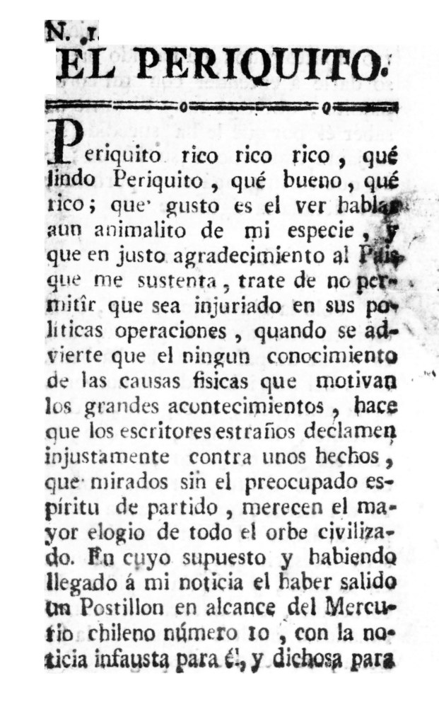 | Reseña | El Periquito se trató de una publicación de un solo número, aparecida en 1822 y dedicada a comentar las noticias de actualidad política del momento, a saber, el proceso independentista peruano. Junto a La Cotorra (Lima, 1822-1823) y El Loro (Lima, 1822), formó parte de una particular trilogía que cuestionó de forma jocosa el ambiente político limeño de la época. Según Fernando Silva Santisteban (1970, p. 84), fue publicado por los mismos editores del Diario de Lima (Lima, 1822), una colaboración de cuatro personas que ocultaron sus nombres bajo los seudónimos de Ascenio, Arístides, Aristómenes y Narciso. Fue impreso en la Imprenta de los Niños Huérfanos, administrada por Nicolás Pineda entre 1822 y 1823. Esta imprenta comenzó a operar en Lima a mediados del siglo XVIII con autorización del virrey como una forma de subvencionar la casa de los niños huérfanos de Lima. Comenzó a publicar desde 1758 y tuvo un papel particular durante el periodo de independencia, hasta su completa extinción en 1824 (Medina, 1904, t. 1, pp. 48-49). La imprenta fue administrada por Guillermo del Río (1808-1811), Bernardino Ruíz (1812-1816), Fernando de Oyague, entre otros. En esta imprenta se publicaron otros títulos como El Semanario (Lima, 1814), Anti-argos (Lima, 1813), El Imparcial (Lima, 1822), El Cometa (Lima, 1811-1813), entre otros. En ese único número, El Periquito cuestionó la política de Bernardo de Monteagudo por su rigurosidad. Lo consideró como un traidor al buen trato que había recibido por los limeños. Así, cuando falleció Monteagudo, El Periquito respondió a una nota de El Mercurio chileno, criticando el apoyo a este personaje. También criticó la amortización del papel moneda emprendida desde el gobierno, señalando sus perjuicios para el Estado peruano y la población. Referencias bibliográficas: Medina, J. T. (1904). La imprenta en Lima (1584-1824). Tomo 1. Santiago de Chile: Impreso y Grabado en Casa del Autor. Silva Santisteban, F. (1970). El “Diario de Lima” en 1822. Revista Fénix, (20), 81-85. |