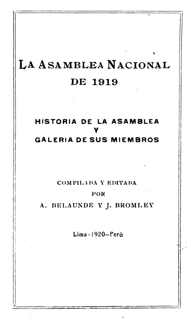 Belaúnde, A. y Bromley, J. (1920). La Asamblea Nacional de 1919: Historia de la Asamblea y galería de sus miembros. Lima: [s.e.]