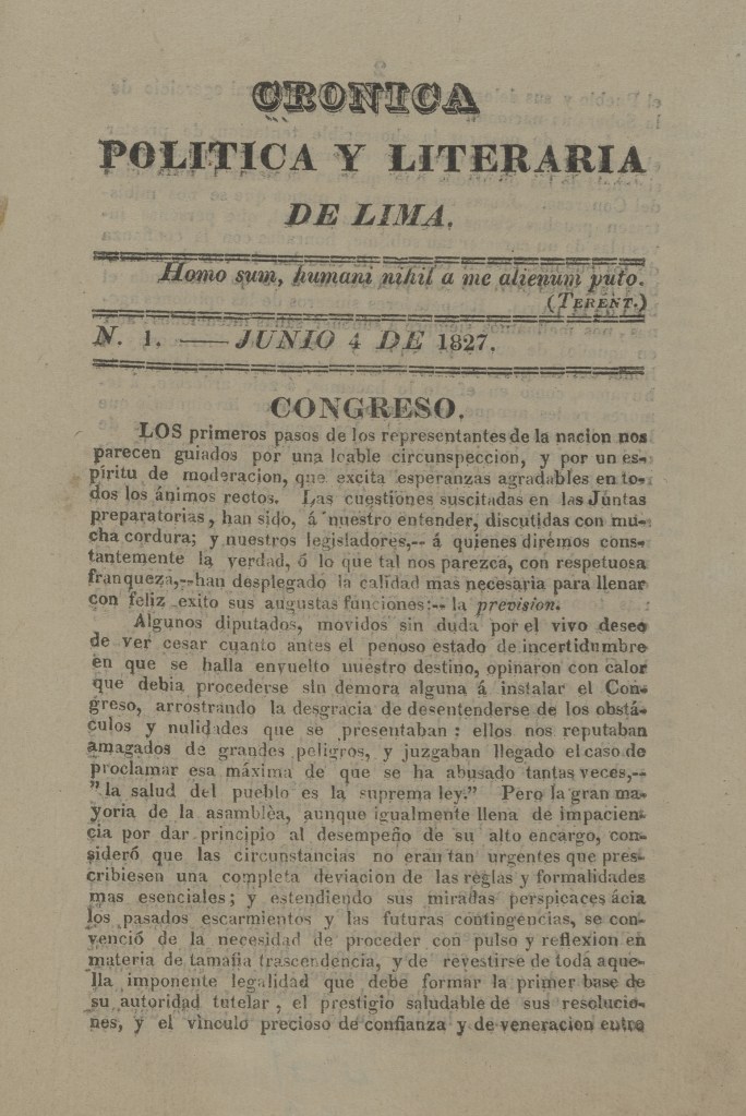 | Reseña | Periódico conservador aparecido en Lima entre el 4 de junio y setiembre de 1827 (5 números), editado en la Imprenta de la Libertad. Fue dirigido por José María Pando, periodista y político peruano partidario de Simón Bolívar, bajo cuya dictadura se había desenvuelto como ministro de Hacienda (1826 a 1826) y de Gobierno y Relaciones Exteriores (1826 a 1827). En ese sentido, la Crónica sirvió de vocero de las principales ideas políticas de Pando. Los contenidos literarios que se insertaron en Crónica han llevado a considerarlacomo uno de los primeros antecedentes del periodismo literario en el Perú. Representó un rescate del periodismo de la tónica de combate en la que estuvo inmersa en la guerra de independencia (Varillas, 2010, p. 24). Asimismo, si bien por la época en que apareció no debe llamar la atención que no haya sido influenciado por el romanticismo español, sus editores mostraron estar al tanto de las publicaciones peninsulares recientes (Varillas, 2008, p. 222). Además de lo literario, publicó artículos sobre política interna y externa del momento, los cuales son calificados por Mariano Fleipe Paz Soldán (1879, p. 18) como “excelentes” y que resulta “sensible la corta vida de esta publicación”. Destacan artículos dedicados a la idea de la patria, la obediencia a la ley, la educación, entre otros, así como informaciones desde Colombia y Buenos Aires, En opinión de Varillas (2010, p. 24), es posible que Pando, quien después de haber sido canciller de Bolívar se alejó de su condición de empleado público en enero de 1827, se animara a dirigir la Crónica personalmente; sin embargo, tentado por la política, pronto optó por financiar una publicación de cobertura mucho mayor, a saber, el Mercurio Peruano (Lima, 1827-1834, 1839-1840). Ello marcaría el fin de la aparición de la Crónica. Referencias bibliográficas: Paz Soldán, M. F. (1879). Biblioteca peruana. Lima: Imprenta Liberal. Varillas Montenegro, A. (2008). El Periodismo en la Historia del Perú: Desde sus orígenes hasta 1850. Lima: Fondo Editorial de la USMP. Varillas Montenegro, A. (2010). El Periodismo Literario y su Aparición en el Perú Republicano. Boletín del Instituto Riva-Agüero, (35), 19-40. |