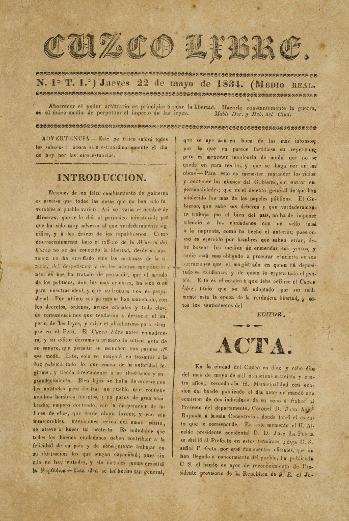 | Reseña | A mediados de 1834 se dio el cambio de gobierno en nuestro país: del conservadurismo de Agustín Gamarra al liberalismo de Luis José de Orbegoso. Fue en ese contexto que apareció Cuzco Libre, un periódico que se editó de forma continua en la ciudad del Cusco entre 1834 y 1835. Este periódico se convirtió en el vocero oficial del gobierno bajo los auspicios de Orbegoso, sustituyendo en dicho papel a Minerva del Cuzco. Este último había sido patrocinado por el prefecto Juan Bujanda, mano derecha de Gamarra; sin embargo, tras la elección provisoria de Orbegoso, su posición oficial se impuso en la ciudad imperial y llevó a que se le cambiara el nombre por el de Cuzco Libre. Según Glave (2004, p. 106), “Mariano Ocampo dirige el periódico, por orden del prefecto post-gamarrista José La Puerta”. Para Cahuata (1990, p. 73) “el Gobierno, no tuvo imprenta propia y tuvo que usar una particular: la imprenta libre de Juan B. Gallegos, administrada por P. Evaristo Gonzales”. Su primer número salió en mayo de 1834 e indicaba que saldría todos los sábados. A precio de medio real, se editaron 35 números consecutivos hasta enero de 1835, año conflictivo previo a la Confederación Perú-Boliviana. En mayo de 1835 se imprimió un número adicional extraordinario, pero no indica su correlación. Publicaba artículos de oficio como cartas, decretos de ministerios, bandos, circulares, proclamas y demás comunicados de las autoridades; noticias del interior y del exterior; artículos de política; variedad; entre otros, pero la mayoría de sus hojas trataban sobre asuntos oficiales. Si alguien está interesado en conocer toda la información oficial local y nacional que emitía el gobierno, tanto como el ejecutivo y el legislativo, puede revisar este periódico. Referencias bibliográficas: Cahuata, F. (1990). Historia del periodismo cusqueño. Época Republicana. Lima: SAGSA. Glave, L. (2004). La república instalada: Formación nacional y prensa en el Cuzco 1825-1839. Lima: Instituto de Estudios Peruanos, Instituto Francés de Estudios Andinos. |