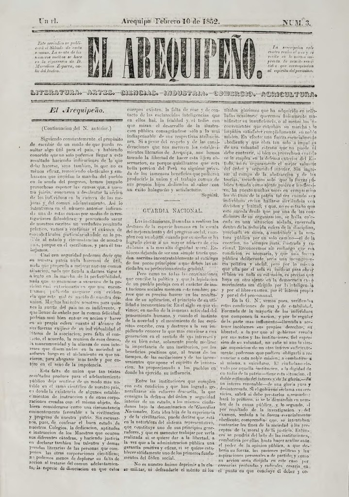 | Reseña | El Arequipeño fue un periódico regional que se publicó entre el 24 de enero hasta al menos el 1 de octubre de 1852 (32 números hasta la fecha), impreso en los talleres de Francisco Ibañez y hermanos. Se enfocó a temas vinculados a la literatura, comercio, ciencias y agricultura, como se detalla en el subtítulo de este diario. Nació, según sus editores, porque “Hace tiempo que se siente en este país la necesidad de un periodico que nacido del uso racional de la prensa, pueda hacer realizables, siquiera en parte, los inmensos beneficios que esta provechosa institución está llamada a producir” (El Arequipeño, 1852: nro. 1). Por ello, entre sus columnas se encuentran artículos referentes a la región de Arequipa y temas nacionales. Es ahí la importancia y la diferencia que podía marcar un periódico con dichas características, según los editores: “Arequipa ha llegado ya a un grado de civilización en que se hace muy notable la falta de un periodico de ciencias, industria, costumbre” (El Arequipeño, 1852: nro. 1). De esta forma, encontramos en este diario diferentes publicaciones que aportan a la historia de Arequipa de la década del 50 del siglo XIX arequipeño. Otro aporte son las columnas de opinión, tanto sobre temas nacionales como extranjeros, lo que nos da a entender la importancia que dieron sus editores de ir más allá de la literatura o costumbres, enfocándose en la problemática social y política: “Procuraremos amenizar cuanto nos sea posible la edición del Arequipeño con las noticias de ultramar que juzguemos útiles o curiosas, atendida la estrecha circulación que tienen, en nuestro país, los escritores extranjeros. Insertamos todas aquellas piezas de interés en el ramo de costumbres, de ciencias, de industria, de mecánica y de política, y todos los artículos de bella literatura cuyo interés creamos fuera de duda; y concluiremos matizando las columnas del periodico con algunas variedades útiles a la vez que entretenidas, y con escogidos folletines” (El Arequipeño, 1852: nro. 1). |