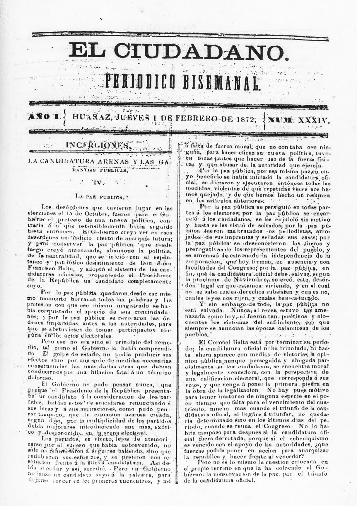 | Reseña | El Ciudadano fue un periódico de Huaraz que inició su circulación el 23 septiembre de 1871, siendo su editor e impresor responsable Mariano Salinas. Tuvo una recurrencia de dos veces por semana: “Saldrá por ahora de pequeñas dimensiones, publicándose de ordinario los lunes y jueves; y extraordinariamente cuando sea preciso, por la clase o abundancia de materiales” (El Ciudadano, 1871: nro. 1). Según Mariano Felipe Paz Soldán (1879, p. 94), apareció hasta 1875. Según sus propias palabras: “tiene a satisfacer una necesidad de todos sentida; y se prometen por lo mismo sus Editores protección entusiasta y acogida benévola de las personas ilustradas” (1871: nro. 1). Otro punto a resaltar, es que El Ciudadano afirma que su deber era “la difusión de la verdad, la defensa de las libertades públicas y el sostenimiento de los intereses de esta vasta porción del territorio nacional” (1871: nro. 2). Se detalla entre sus páginas sobre la problemática de imprenta durante esta época, conflicto que se describe muy bien por parte de la editorial: “Los que lo escriben son ciudadanos humildes y honrados que se dirigen a otros, que se encuentran a su nivel, o que debe ser indulgentes, en gracia del objeto que se proponen los Redactores del periodico” (1871: nro. 2). Se resalta que en El Ciudadano José Toribio de Polo inició por entregas periódicas la publicación de sus “Apuntes sobre la historia eclesiástica de Arequipa”, reeditados posteriormente por Manuel de Odriozola en el onceavo volúmen de su Colección de documentos literarios del Perú. Según J. de la Riva Agüero (1918, p. 129), en dicha obra Polo “reunía los materiales para la historia de la Iglesia peruana, principal tarea de su vida (…). También, en sus números contienen un sumario y la “Gacetilla” donde se insertaron noticias de la región desde lo político a lo social. Referencias bibliográficas: Paz Soldán, M. F. (1879). Biblioteca peruana. Lima: Imprenta Liberal. Riva Aguero, J. (1918). J. Toribio Polo. Mercurio Peruano, 1(3), 125-132. |