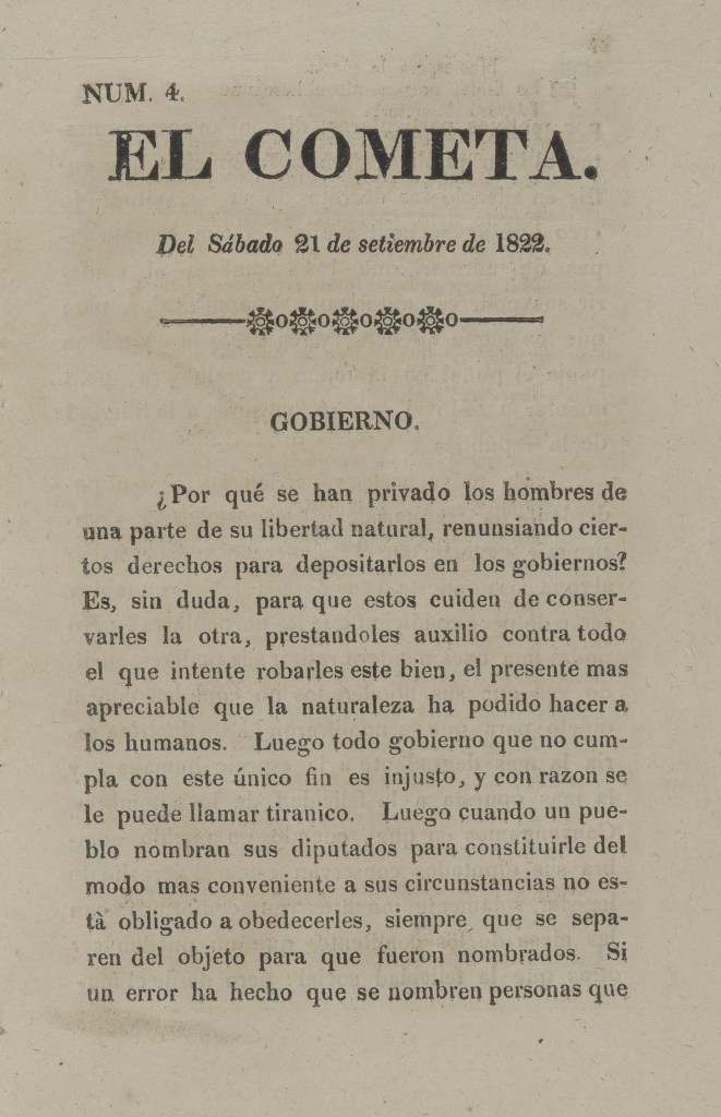 | Reseña | El Cometa fue un periodico político que se emitió en Lima del 17 de agosto al 21 de septiembre de 1822 (4 números), impreso en los talleres de J. Antonio López (Odriozola, 1924, p. 177; Paz Soldán, 1879, p. 14; Vargas, 1957, t. 12, p. 120). Su nombre, según las propias palabras del editor, respondió a tres razones. Primero, “porque entre los antiguos se creía que la aparición de los astros que llevan este nombre anunciaba grandes revoluciones en los estados”, refiriéndose al proceso independentista peruano; segundo, “porque segun la opinion de los antiguos, estos astros no tenían períodos determinados y mi papel [el diario] solo saldrá cuando pueda contener alguna materia interesante”; y tercero, “porque así como los cometas unas veces aparecen con barbas y otras con cola, así también el mio unas veces saldrá en medio pliego, otras uno, en uno y medio” (El Cometa, 1822: nro. 1). Es decir, se anunciaba como un diario revolucionario: “en un tiempo en que Lima esta llena de periódicos, parece un efecto de locura ó de vanidad anunciar otro nuevo, y principalmente cuando apenas podran venderse los que en el dia se escriben. Sin embargo, el que se propone un objeto de esta especie, no por utilidad propia, sino por contribuir en cuanto esté de su parte a la ilustración pública que es la base de la libertad, se contenta con haber conseguido este único, pero importante fin, aunque se a costa de algunas erogaciones” (El Cometa, 1822: nro. 1). En sus cuatro números, resalta el debate sobre el modelo de gobierno más adecuado para el país, enmarcado en las ideas ilustradas que se tuvo en aquella época. Sus artículos tienen un corte reflexivo sobre el gobierno democrático y republicano en un territorio tan extenso como es el peruano, por ello busca definir conceptos como gobierno, monarquía, aristocracia y libertad. Referencias bibliográficas: Odriozola, M. de (1924). Catálogo de los periódicos nacionales existentes en la Biblioteca Nacional. Boletín Bibliográfico, 1(10-14), 170-180. Paz Soldán, M. F. (1879). Biblioteca peruana. Lima: Imprenta Liberal. Vargas Ugarte, R. (1957). Biblioteca Peruana. Tomo 12: Impresos Peruanos, 1809-1825. Lima: Tipografía Peruana. |