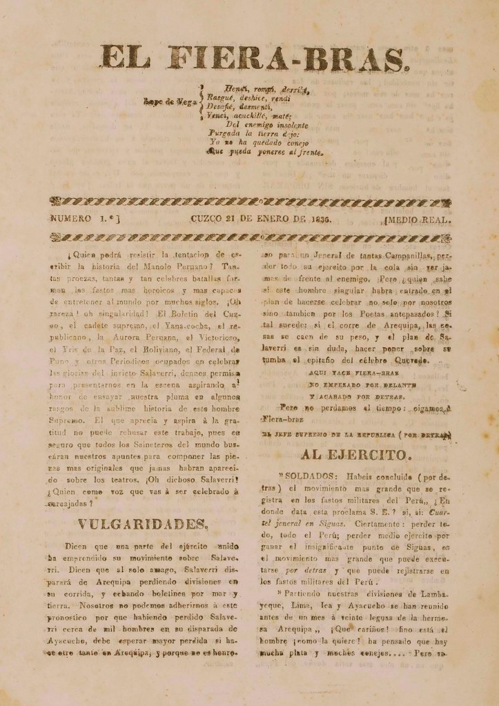 | Reseña | El nacimiento de la República independiente del Perú a inicios del siglo XIX no sólo desembocó en el encuentro bélico entre los criollos limeños y provincianos, liderados por caudillos militares, sino también en la permeabilización de distintos conceptos relacionados a la libertad, la nación y la patria a través de publicaciones periódicas en el que colaboraban distintos ideólogos y actores políticos (Arellano, 2012, p. 172). La efervescencia de la prensa en aquellos años fue la vitrina de los conflictos de intereses suscitados a partir de nuestra independencia política. En ese sentido, la ciudad del Cusco no fue ajena a tal fenómeno, ya que en sus calles se vivían los debates de la época, desde la publicación de opiniones, críticas y ensayos en sus principales medios escritos. El panfleto El Fiera-Bras, en ese contexto, tenía la particularidad de ejercer la sátira para ridiculizar al bando nor-peruano en medio de la guerra civil acaecida durante el gobierno del general Salaverry. En un lenguaje punzante y a través de varios análisis burlescos de los discursos presidenciales, además de la creación de falsos diálogos y comunicados oficiales, se pone en tela de juicio las capacidades militares y políticas del jefe de Estado, contrastando indirectamente con los procederes, correspondencias y decretos públicos de los líderes de la resistencia liberal y del Ejército Unido, como Andrés de Santa Cruz y Luis José de Orbegoso (Cahuata, 1990, 114; Glave, 2004, 172-174). Si bien no hay registro identitario del fundador y colaboradores de esta publicación, esto es comprensible dado que la coyuntura política ameritó escribir tras las sombras. Su precio fue medio real. Editado eventualmente, logró posicionar 11 números, aunque Cahuata revela la existencia de un número más -no digitalizado-, en el que se exalta la victoria santacrucista en Socabaya (1990, 115). Fue publicado por la imprenta de Evaristo González, un empresario cusqueño que vió en la prensa un negocio lucrativo y una vía para mantener su posición administrativa en las instituciones de la ciudad, apartándose para ello de toda lucha política (Walker, 2001, 11). Dada las características de la presente publicación, El Fiera-Bras constituye una fuente documental importante para la comprensión de los debates ideológicos en el Perú del siglo XIX, el papel de la sátira en la producción periodística a inicios de la República, así como el protagonismo de la regiones en los principales acontecimientos militares y políticos de la historia nacional. Referencias bibliográficas: Arellano, J. (2012). Lenguaje político y guerra: las disputas por la legitimidad durante la guerra civil en el Perú (1834-1836). Memoria y sociedad, 16(33), 171-189. Cahuata, F. (1990). Historia del periodismo cusqueño. Época Republicana. Lima: SAGSA. Glave, L. (2004). La república instalada: Formación nacional y prensa en el Cuzco 1825-1939. Lima: IFEA. Walker, C. (2001). “La orgía periodística”: prensa y cultura política en el Cuzco durante la joven república. Revista de Indias, 61(221), 7-26. |