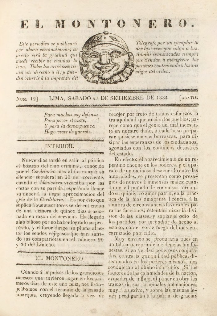 | Contenidos destacados | “Un consejo patriótico” (1834: nro. 1). “Periódicos” (1834: nro. 2). “Chismografía” (1834: nro. 3). “El Montonero, en los días del Exmo. Sr. D. Luis José Orbegoso, lo felicita con el siguiente soneto” (1834: nro. 6). “Al Limeño [periódico]” (1834: nro. 10). “El Hijo del Montonero” (1834: nro. 14). “Justo castigo a un bribón o sea el Montonero a su supuesto hijo” (1834: nro. 14). |