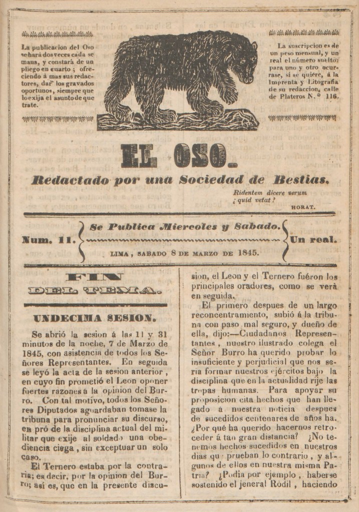 | Reseña | A mediados del siglo XIX, durante los dos gobiernos de Ramón Castilla, el periodismo satírico peruano alcanzó su más alto nivel de agresividad, influido por los debates entre el autoritarismo caudillista y el liberalismo (Gargurevich, 1991, pp. 67, 72). En este contexto apareció El Oso, periódico burlesco publicado en Lima en 1845 en la Imprenta de J. Montoya. Según Varillas (2008, p. 391) y Paz Soldán (1879, p. 48), apareció entre el 1 de febrero y el 31 de mayo con 32 números; sin embargo, publicó al menos un número más, el 33, el 24 de mayo del mismo año. Según Evaristo San Cristóval (1945, p. 7), se caracterizó por resaltar la figura de Ramón Castilla en el contexto de las elecciones de 1845. Desvanecía todas las invenciones que se forjaban en torno a su persona, invenciones que aparecieron en periódicos como El Patriota del Cumbe (Trujillo, 1844) (San Cristóval, 1945, p. 7). Asimismo, ridiculizó a Mariano Ignacio Vivanco, rival de Castilla durante la guerra civil peruana de 1843-1844. Sus redactores aparecieron bajo pseudónimos animales, siendo su editor principal el “Oso”, seguido de “Asno”, “Rinoceronte”, entre otros. Según José Domingo Cortés (1871, p. 392), tuvo entre sus colaboradores a José Toribio Mansilla, poeta y comediógrafo limeño. Insertó las primeras caricaturas políticas aparecidas en la prensa peruana, estando a la par de importantes títulos como El Murciélago (Lima, 1855) de Manuel Atanasio Fuentes. Entre sus principales caricaturistas estuvieron “Ginocchio”, “León” y “Rojas”, destacando caricaturas como “Los redactores del Oso enjaulados”, “Quien no cede a las razones a los puñetazos cederá”, “El Oso para escribir medita”, “Un refutador del Oso”, “No se trata de morder sino de hablar”, “El reo se haya seguro”, entre otros. Referencias bibliográficas: Domingo Cortés, J. (1871). Parnaso peruano. Santiago de Chile: Imprenta Albion de Cox y Taylor. Paz Soldán, M. F. (1879). Biblioteca peruana. Lima: Imprenta Liberal. Varillas Montenegro, A. (2008). El Periodismo en la Historia del Perú: Desde sus orígenes hasta 1850. Lima: Fondo Editorial de la USMP. San Cristóval, E. (1945). El mariscal Castilla y el periodismo de su época. Lima: Compañía de Impresiones y Publicidad. |