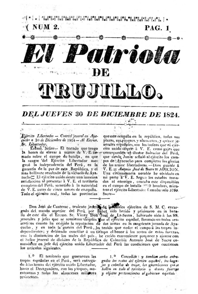 | Reseña | El Patriota de Trujillo fue un periódico que inició su circulación el 11 de diciembre de 1824, en el contexto de la batalla de Ayacucho. Apareció en la Imprenta de la Ciudad, administrada por Jaciento Paredes (Sociedad Bolivariana de Venezuela, 1964, p. 142; Barreto, 1989, p. 17). En la edición número 3 del 20 de enero de 1825 se avisa que el periodico saldría infaliblemente todos los jueves y continuó su producción hasta el número 10 (Vargas Ugarte, 1935, t. 12, pp. 208-209), y cerró antes de cumplir un año (Barreto, 1989, p. 18). Según lo señalado por R. Varga Ugarte (1935, t. 12, pp. 208-209), a partir de su edición número 6 cambió de nombre, adoptando el título de “El Patriota de Bolívar”, por asimilarse al cambio de nombre de la ciudad de Trujillo por orden de Simón Bolívar, el cuál duró poco tiempo. El pie de imprenta también fue modificado, detallándose como Bolívar en lugar de Trujillo. Resalta la edición del 30 de diciembre de 1824, en la cual se inserta una carta del general Antonio José de Sucre, remitida desde el Cuartel General de Ayacucho. Su importancia reside en que está fechada el 10 de diciembre de 1824, día siguiente de la victoria que consolidó la independencia. Otro documento insertado es el Acta de Capitulación que firmaron el general realista José de Canterac y Sucre, fechada el 9 de diciembre de 1824 en Ayacucho (Llanos, 2004, p. 32-33) (Barreto, 1989, p. 17). Referencias bibliográficas: Barreto, W. (1989). El Periodismo en Trujillo. Lima: Colegio de Periodistas del Perú. Llanos, S. (2004). Los Periodistas de La Libertad. Lima: Impresiones Peruanas. Sociedad Bolivariana de Venezuela (1964). Escritos del Libertador. Caracas: Cuatricentenario de la Ciudad de Caracas. Vargas Ugarte, R. (1957). Biblioteca Peruana. T. XII: Impresos Peruanos, 1809-1825. Lima: Tipografía Peruana. |
