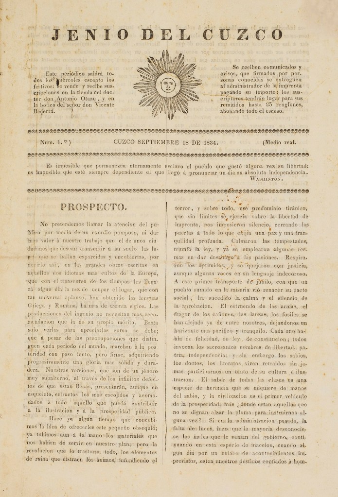| Reseña | Tras la situación de inestabilidad política que siguió al final del gobierno conservador de Agustín Gamarra (1829-1833), llegaron nuevos tiempos que dieron pie a la aparición de publicaciones periódicas con fines literarios y culturales. El predominio tiránico que se ejerció sobre la libertad de imprenta quedó estancado con este cambio; al menos, por unos meses, mientras se instalaba el gobierno de Luis José de Orbegoso, de tendencia liberal, bajo la influencia y apoyo de la Convención Nacional. Es en ese contexto que nació el Jenio del Cuzco. Fue un periódico independiente que se editó en la imprenta pública de Evaristo González, conocido impresor de la ciudad. Según su encabezado, salía todos los miércoles, a excepción de los que eran festivos. Recibían comunicados y avisos debidamente firmados por personas conocidas (aunque no salían sus nombres en el impreso) y los publicaban previo pago. Recibía suscripciones y se vendía al precio de medio real. Fue de corta duración, ya que solo 4 números salieron a la luz entre los meses de septiembre y octubre de 1834. Era de publicación anónima y contaba con colaboradores que firmaban con seudónimos, a excepción de un remitido que lleva la firma de sus autores (Jenio del Cuzco, 1834: nro.4). A pesar de su limitado tiraje, este periódico nos ofrece una visión de proyecto cultural para el Cuzco, ya que el contenido que publicaba eran remitidos y artículos de política, literatura, higiene, economía doméstica y variedades. El objetivo de este impreso, según su primer número, era el presentar las luces de las letras de Europa y que éstas pudieran instruir y agradar al público. Tenían como fin el ilustrar e instruir a la sociedad cusqueña en diversas temáticas. Era un periódico con espíritu periodístico y literario, distinto a los demás periódicos de su época, que estaban en pugnas de poder político (Glave, 2004, p. 107). Referencias bibliográficas: Glave, L. (2004). La república instalada: Formación nacional y prensa en el Cuzco 1825-1839. Lima: Instituto de Estudios Peruanos, Instituto Francés de Estudios Andinos. |