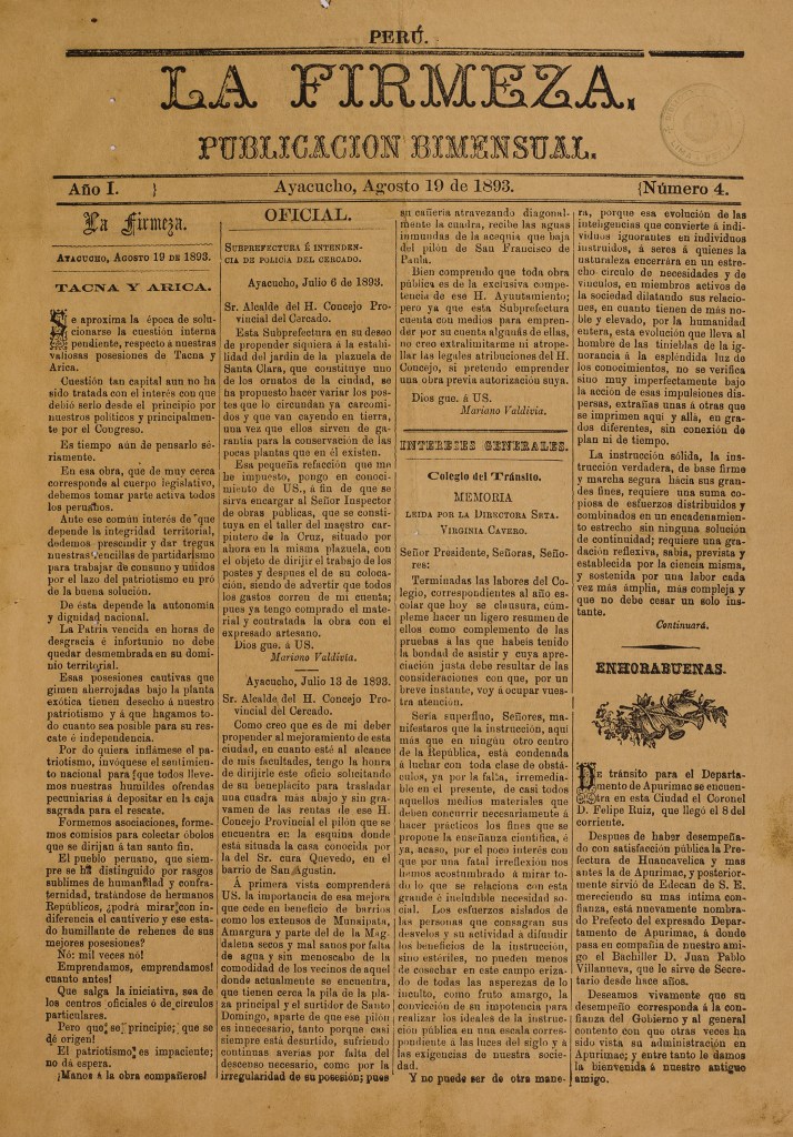 | Reseña | Para el inicio de la guerra de 1879, la élite ayacuchana decidió aportar en lo más mínimo al financiamiento del ejército nacional. Esta desconfianza también afectó a las masas indígenas, adscritas a las haciendas desde momentos coloniales. La idea de nación no existía y el Estado apelaba a una colectividad sostenida en una aristocracia capitalina incapaz. La reacción respecto a la presencia chilena sólo cambió cuando el invasor comenzó a afectar los intereses regionales. Los hacendados miraron la coyuntura con horror, cuando incluso el general Cáceres comandó la resistencia con una gran masa de campesinos. Hacia el fin de la guerra, el saldo demográfico a nivel nacional era impactante: los ricos ya no existían y el número de mendigos aumentaron. A pesar de ello, las dinámicas hacendatarias volvieron a ser las mismas, y solo se pudo hablar de reconstrucción y estabilidad económica hacia fines del siglo XIX, consecuencia del aumento de impuestos férreos y el endeudamiento externo (Armas, 2000, p. 145; Infante y Vasquez, 2012, pp. 227-258). Debido a que una refundación nacional era, en esos años, una utopía, principalmente por los problemas sociales, políticos y económicos que la guerra agudizó, la prensa de la posguerra, ayacuchana y nacional, buscó desentenderse de cualquier recuerdo nefasto. En ese contexto surge, como otros periódicos más, La Firmeza. Ésta fue una publicación que se presentó como bimensual, editada posiblemente entre mayo y agosto de 1893 en la ciudad de Huamanga. Caracterizada por tener colaboradores anónimos, su eje temático versaba sobre notas de actualidad local, nacional e internacional, escritos literarios seleccionados, crónicas sobre la ciudad y la élite ayacuchana y anuncios. Si bien sus páginas se desentienden de alguna posición ideológica u oficialista, logran transmitir sucesos importantes de la coyuntura política relacionadas a la posguerra, así como deslindarse de las agitaciones regionales contra el gobierno de Remigio Morales Bermúdez y sus medidas para la reconstrucción nacional. Fue editada desde la imprenta de “El Progreso”, administrada y fundada por Estevan Palomino, encargado también de la impresión de La Unión y El Independiente, circulantes desde 1857 (Infante y Vasquez, 2012, pp. 156; 246). Costaba solo 10 centavos, y permitía una suscripción mensual y exclusiva. Dada las características de la presente publicación, La Firmeza constituye una fuente importante para acercarnos a la sociedad ayacuchana de la posguerra, sus instituciones, su vinculación con la coyuntura política, como también a la vida cotidiana de la élite e intelectualidad locales para fines del siglo XIX. Referencias bibliográficas: Armas, F. (2000). Perú: algunas consideraciones sobre el sector fiscal entre 1884 y 1992. Apuntes: Revista de Ciencias Sociales, (47), 139-147 Infante C. y Vasquez J. (2012). La prensa ayacuchana del siglo XIX. Lima: Manoalzada Editores. |