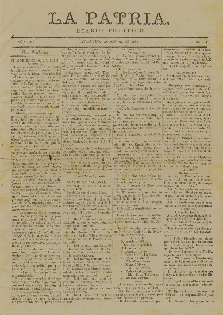 | Reseña | Periódico ayacuchano aparecido en el contexto de la guerra del Pacífico, entre el 20 de agosto y al menos el 28 de octubre de 1881 (16 números). Fue impreso en la Imprenta de la Patria, administrada en diversos momentos por Juan Miranda, Abraham Vega y Andrés A. Romero. Según su presentación: “¡La Patria! palabra que simboliza todas las nobles y generosas aspiraciones, los grandes y gloriosos sacrificios, el varonil aliento y decisión para arrostrar el peligro y el infortunio. En momentos en que luchamos por su honra y por su salvación, nuestras modestas pero entusiastas tareas de periodismo no pueden llevar otro lema que aquel” (La Patria, 1881: nro. 1, p. 1). Estuvo bajo la dirección de Benito Neto, periodista uruguayo que llegó a Lima en 1870, con experiencia en diarios como La Tribuna de Montevideo y La Nación Argentina de Buenos Aires. En la capital conoció a Nicolás de Piérola, adhiriéndose a sus ideas y fue por tanto ardoroso anticivilista —tendencia que puede observarse en La Patria—. Cuando se declaró el conflicto bélico con Chile, no dudó en ocupar la plaza de corresponsal de guerra en el diario limeño La Patria. Invadida la ciudad de Lima por las tropas chilenas, viajó a la sierra sur, colaborando en la aparición de La Patria ayacuchana (Gargurevich, 2015, pp. 42-43, 47). Según Alberto Tauro del Pino (1983, p. 29), es posible que este periódico fuera concebido como un eco del diario limeño de igual título. Asimismo, contó con la colaboración del teniente coronel Celso N. Zuleta, Julián F. Segura y José Rafael Lepiani, entre otros. Sus páginas insertaron crónicas alusivas a los debates de la Asamblea Nacional en Ayacucho; noticias sobre Lima y el Gobierno de la Magdalena; información sobre los protocolos del pacto federal con Bolivia y los correspondientes dictámenes legislativos; notas sobre la Ley de Imprenta; asimismo, correspondencia extranjera, especialmente europea. Referencias bibliográficas: Gargurevich, J. (2015). Los corresponsales peruanos en la Guerra del Pacífico. Conexión, 4(4), 34-49. Tauro del Pino, A. (1983). La Unidad Nacional, alma de la Breña. En: CPHEP (ed.), La Guerra del Pacífico, 1879-1883. Tomo III: La Resistencia de la Breña. Vol. 1: Huamachuco y el Alma Nacional (1882-1884) (pp. 11-40). Lima: CPHEP. |