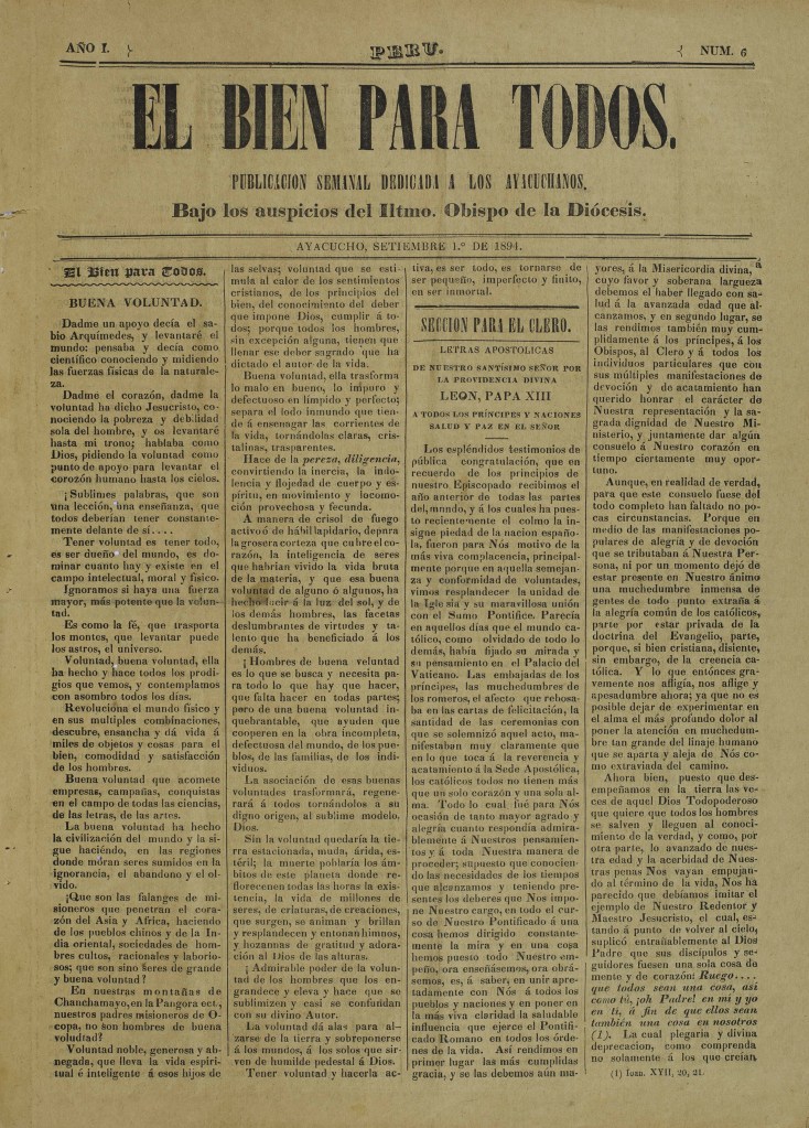 | Título(s) alternativo(s) | El Bien para Todos: Publicación Semanal Dedicada a los Ayacuchanos, Bajo los Auspicios del Iltmo. Obispo de la Diócesis |