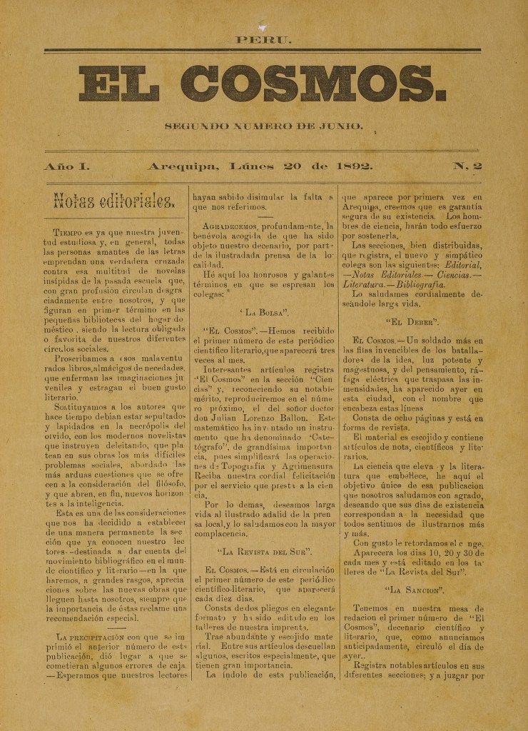 | Reseña | El Cosmos fue un periódico que empezó a publicarse en junio de 1892 en Arequipa y cuyas páginas abordaron el desarrollo de las ciencias en el país. Es importante mencionar que sus publicaciones informaron sobre distintos temas como las expediciones extranjeras que recorrieron nuestro territorio, los instrumentos científicos empleados en la época, los beneficios del clima para la salud o los artículos extranjeros de contenido científico que eran traducidos a fin de promover su lectura. Recordemos que el siglo XIX fue el siglo de la mundialización de la industria, transportes y comunicaciones. Ello tuvo correlación en el desarrollo de la investigación científica, aplicación y difusión (Guzmán, 2017, p. 149). Una nota resaltante es “El observatorio astronómico de Arequipa” (El Cosmos, 1892: nro. 1). Allí se comenta que en EE.UU. se colocaron grandes telescopios pero que tuvieron problemas para tener claridad en lo que observaban debido a la falta de “firmeza del aire” y otros inconvenientes adicionales. Esto llevó a que se envíe una expedición a nuestro país y se colocaron estaciones meteorológicas en diferentes lugares como Chosica y Arequipa. Si bien Lima era atractiva y era reconocida en el extranjero, otros lugares al interior del país comenzaron a llamar la atención en el siglo XIX y fueron aprovechados para realizar distintas investigaciones (Seiner, 2004, p. 2), como es el caso de la Ciudad Blanca. Otro texto interesante de revisar es “Pedagogía” (El Cosmos, 1892: nro. 1), ya que podemos notar como dentro de la comunidad académica reconocen que docentes están probando diferentes enfoques en sus clases, lo cual se relaciona con las nuevas propuestas difundidas en el extranjero y que serán aplicadas en nuestro país por algunos y algunas docentes de esos años. Tras la Guerra del Pacífico, las mujeres tendrán una destacable actuación pública, no sólo a través de la palabra escrita, sino también mediante la fundación de escuelas. En estos espacios se promoverá la aplicación de propuestas pedagógicas como las de Jean Frederich Herbart, Johan Pestalozzi, Friedrich Froebel, entre otros; asimismo, se promoverá la autonomía y el secularismo en los estudiantes (Mannarelli, 2013). También es importante revisar “Arequipa como punto de sanidad” (El Cosmos, 1892: nro. 3), en donde el médico Jacobo Dickson narra las características del clima arequipeño y explica por qué podría ser útil ir allí para contrarrestar ciertas enfermedades. Como podemos observar, este periódico no solo colaboró con la difusión científica, sino también buscó resaltar la importancia de Arequipa en diferentes aspectos del campo científico y esto se hace presente en los distintos números que llegaron a publicarse. Referencias bibliográficas: Guzmán, R. (2017). Ciencia, tecnología y sociedad en el siglo XIX: El concepto de energía, su historia y sus significados culturales. Revista de Humanidades, (36). Mannarelli, M. (2013). Las mujeres y sus propuestas educativas, 1870 – 1930. Lima: Fondo Editorial de la Derrama Magisterial. Seiner, L. (2004). La historia de la ciencia en el Perú: meteorología y sociedad, siglos XVIII – XIX [Tesis para optar el grado académico de magíster en Historia]. Lima: Pontificia Universidad Católica del Perú. |