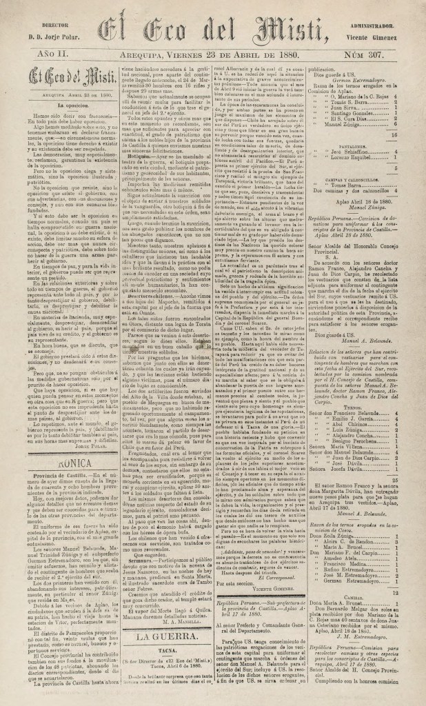 | Reseña | El Eco del Misti fue un periódico de publicación diaria que mostró sus páginas al público en el año 1879 en Arequipa y que llegó a su fin en 1881. Cubrió sucesos importantes de la Guerra del Pacífico, acontecimiento que marcó un antes y un después en la historia del periodismo, pues generó que los grandes diarios se unan frente a un enemigo común y también impulsó que las tiradas se incrementaran por las ansias de la población de enterarse sobre lo que ocurría en el país. Sin embargo, ya cuando las tropas chilenas se encontraban tomando parte del territorio, muchos de estos diarios dejaron de publicarse por un tiempo, y en otros casos de manera definitiva, lo cual generó un estancamiento en el avance del periodismo local (Mendoza, 2016, pp. 44-46). Dentro de sus páginas podemos observar noticias y columnas que se tomaban de la prensa extranjera, ya sea de Chile, Argentina, EE.UU., entre otros. Asimismo, podemos observar acciones colectivas y peticiones de parte de la ciudadanía para poder atender a los heridos. Resaltamos, por ejemplo, el compromiso y participación de las mujeres en la guerra a través de promover y ofrecer servicios de atención médica y que se muestra en el periódico. Además, se resalta en El Eco del Misti las relaciones internacionales que el país trató de fortalecer durante los enfrentamientos. Ofrece también información respecto a la situación económica, así como las medidas que se fueron tomando en relación a ello; por ejemplo, se mencionan los recursos que se importaban y exportaban durante estos años. Asimismo, se observan expresiones de la población para recordar a los héroes caídos, promover la recolección de fondos y motivar la defensa de la patria (Alanya, 2022). En resumen, es una fuente de consulta necesaria para los que deseen abordar el tema de la Guerra del Pacífico. Referencias bibliográficas: Alanya, O. (11 de octubre del 2022). Batalla de Angamos: Arequipa y su ¡Venganza eterna contra Chile! Tomenota. Mendoza, M. (2016). 100 años de periodismo en el Perú (1900 – 1948). Tomo 1. Lima: Fondo Editorial de la Universidad de Lima. |