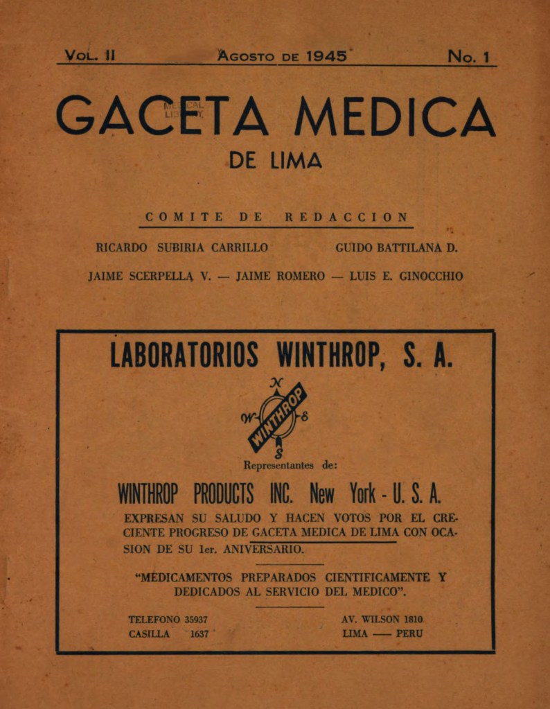 | Reseña | La Gaceta Médica de Lima fue una revista científica peruana aparecida entre 1944 y 1949 destinada a publicar trabajos de medicina, cirugía y especialidades, impreso en los talleres de Editora Médica Peruana. En su presentación se indica que “esta revista fue fundada al impulso de una aspiración saturada de ideales y que en esta misma reside la seguridad de que hemos de consagrar indeclinable empeño” (Gaceta Médica de Lima, 1945: nro. 1, p. 9). Fue calificada por Javier Arias-Stella (2015, p. 58) como una “revista estudiantil que alcanzó buen nivel y larga duración” y que, junto a otra revista estudiantil de menor permanencia, “se trataba de esfuerzos netamente académicos que acusaban un acendrado idealismo, ingenuidad, voluntad de superación y solidaridad”. Su comité de redacción estuvo conformado por los estudiantes Ricardo Subiría Carrillo, Guido Battilana D., Jaime Scerpella V., Jaime Romero y Luis E. Ginocchio. El contenido de la revista se dividía en las siguientes secciones: artículos originales, conferencias, revisión de casos clínicos, conversatorios clínico-patológicos, análisis de revistas, noticias de libros e información general (congresos, concursos, noticias universitarias, etc.), los mismos que se encontraban imprescindiblemente acompañados de bibliografía, sumario e ilustraciones. De este modo, en la sección destinada a la revisión de Casos Clínicos se publicaban aquellas colaboraciones referidas específicamente a un enfermo que posean especial importancia práctica o incluyan aportaciones nuevas. En la sección Conferencias, se publicaba el texto de las principales conferencias dictadas por facultativos nacionales o extranjeros. También se publicaba una síntesis, comentario o noticia bibliográfica de todo libro, tesis o folleto que era remitido a sus instalaciones. En sus páginas, resaltan los trabajos del Dr. Carlos Alberto Seguín (“Historia Clínica Psico-somática”), del Dr. Honorio Delgado (“La Medicina y la Psicología”), del Dr. Juan B. Lastres (“Verruga Peruana y la Epilepsia”), entre otros. No confundir con la Gaceta Médica de Lima (Lima, 1856-1868), órgano oficial de la Sociedad de Medicina de Lima, destinada a la difusión de artículos pedagógicos, de investigación y análisis relacionados a la práctica médica y farmacéutica nacional y extranjera, a la cátedra universitaria y a la vigilancia de la salud pública, en la que se publicaban también actas y documentos de dicha asociación médica, así como estudios de interés para la comunidad, tales como los referidos al cuidado del ambiente. Referencias bibliográficas: Arias-Stella, J. (2015). De San Fernando a Cayetano Heredia: Homenaje al Alma Mater de la Medicina Peruana. Acta Herediana, (48), 55-65. |