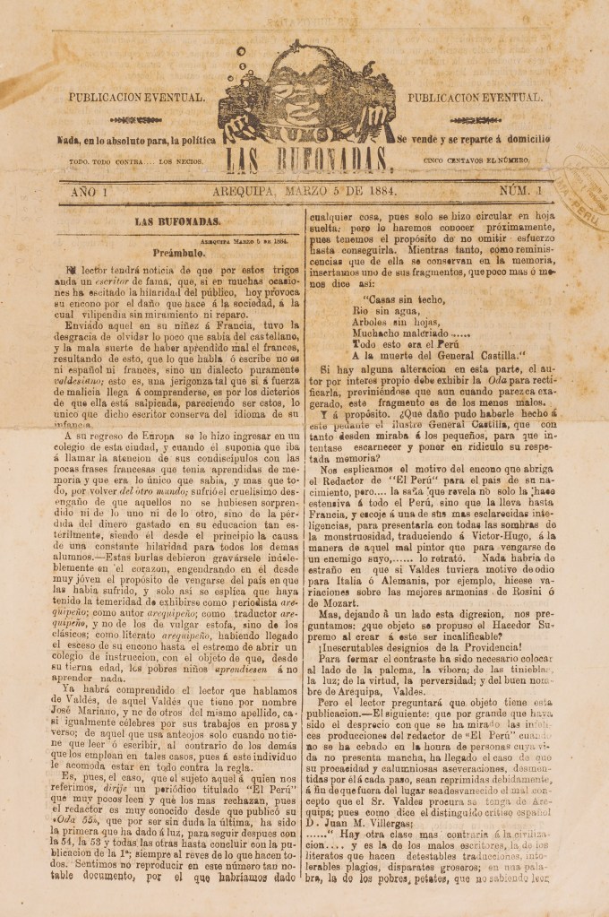 | Reseña | Las Bufonadas fue un periódico de publicación eventual que se fundó en el año 1884 en Arequipa y cuyas publicaciones se realizaron a través de la Imprenta de “El Trabajo” en defensa del gobierno municipal. Según María Mendoza (2016, p. 39), la agenda política en los periódicos fue intensa y sobrecogedora en la segunda mitad del siglo XIX; asimismo, estuvo fuertemente vinculada a los enfrentamientos políticos, lo cual llevará a que muchos de estos redactores tomen postura en relación a algún caudillo o gobernante. Este contexto sin duda influyó en las publicaciones de Las Bufonadas. En sus páginas observamos críticas a algunos personajes, principalmente a José Mariano Valdés, a quien tildan de ignorante y de dirigir maliciosamente el periódico llamado El Perú. También se menciona que Valdés empleaba las publicaciones de su periódico para mancillar honras y dar información tendenciosa lo cual llevaba a los ciudadanos a tener una opinión equivocada. Otra de las críticas que hace Las Bufonadas a Valdés es la traducción que hizo este personaje sobre una de las obras de Víctor Hugo y que fue presentada en El Perú. El columnista Juan Soto resalta que esta traducción cuenta con muchos “desatinos y disparates” que no reproducen fielmente el sentido del autor. Por otra parte, se refutan las observaciones que El Perú hizo respecto a un contrato de barrido que obtuvo aparentemente Moisés Moreno, quien fue acusado de haber aprovechado la amistad que tenía con el alcalde para obtenerlo. En resumen, las páginas de Las Bufonadas muestran un continuo enfrentamiento contra el periódico El Perú y ello se evidencia mediante los comentarios que hacía respecto a su director y sus publicaciones. Ello probablemente se originó porque El Perú acusaba a Las Bufonadas de usar sus páginas en defensa del gobierno municipal. Gran parte de las publicaciones se concentran en los ataques de estos dos periódicos que incluso se hace evidente en los poemas que se pueden leer en sus páginas. Referencias bibliográficas: Mendoza, M. (2016). 100 años de periodismo en el Perú (1900 – 1948). Tomo 1. Lima: Fondo Editorial de la Universidad de Lima. |