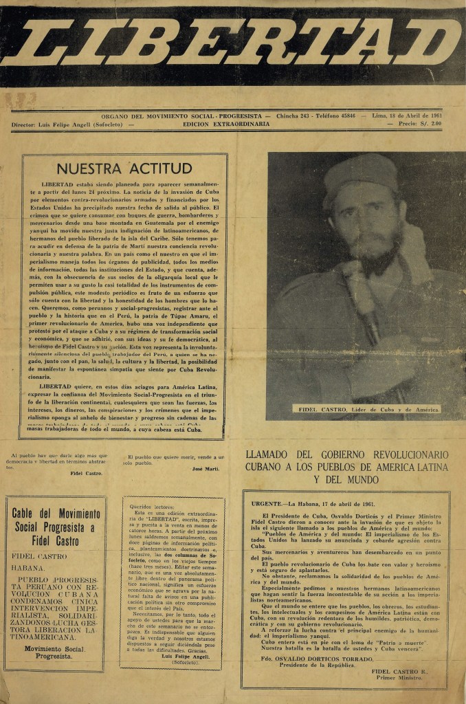 | Reseña | Libertad fue una publicación periódica que nació pocos años después de la Revolución Cubana, lo cual marcó de alguna forma la identidad y aspiración política de muchas personas y de la revista en mención, no solo en el Perú sino de otros países de Latinoamérica. Recordemos que, a inicios de la década del 60, nuestro país experimentó una radicalización ideológica que se manifestó en distintos actores sociales a raíz de lo ocurrido en Cuba (Mangiantini, 2016, p. 1). Esto se evidenció tanto en los grupos campesinos como en una buena parte de intelectuales. Los responsables Libertad consideraron, por ejemplo, que la prensa peruana se encontraba concentrada bajo una oligarquía nacional y que se alineaba a los intereses norteamericanos. Sin embargo, es justo decir que las confrontaciones políticas de la época permitieron que —aún desde periódicos conocidos— se realicen destapes de hechos de corrupción que vinculaban a autoridades pradistas (Quiroz, 2013, pp. 290-291). Complementando lo dicho anteriormente, Libertad fue un semanario que confrontó a través de sus páginas “el imperialismo estadounidense” y las cuestionables decisiones políticas propias de la realidad nacional. En sus páginas leeremos textos de personajes reconocidos como Augusto y Sebastián Salazar Bondy, José Matos Mar, Jorge Bravo Bresani, Alberto Ruiz Eldredge, Guillermo García Montufar, entre otros. Sebastián Salazar Bondy y Guillermo García Montufar, por ejemplo, denuncian, en la edición extraordinaria de Libertad, un posible apoyo en dinero, armas y hombres de parte de EE.UU. para fortalecer a los grupos anticastristas faltando al principio de la no intervención. En esta misma edición, José Matos Mar interpreta que lo sucedido en Cuba tendría grandes repercusiones en los distintos países de América Latina que aún no lograban desarrollarse – según el autor- por el sistema feudal y colonial que aún permanecía en sus territorios. Sin embargo, este no fue el único tema abordado en el periódico. También se escribía sobre hechos nacionales como la expansión del imperio prado y el monopolio del cemento que cada vez más crecía dentro del país. Asimismo, se mencionó que, tras estas maniobras de concentración del negocio, empezaron a subir los precios sin ninguna razón valedera y que todo ello ocurría bajo el apoyo del gobierno de turno. En resumen, esta publicación periódica, aunque corta, es importante de revisar pues tiene una mirada crítica tanto a nivel nacional como internacional y representa las orientaciones intelectuales peruanas frente a lo ocurrido en Cuba. Dicho esto, es importante recalcar que este semanario no está ajeno de estar enmarcado bajo un enfoque político que da forma a la interpretación de las noticias. Referencias bibliográficas: Mangiantini, M (2016). Perú y la estrategia armada en los años sesenta: la reactualización de un debate. Contenciosa, 4(6). Quiroz A. (2013). Historia de la corrupción en el Perú. 2a ed. Lima: Instituto de Estudios Peruanos. |