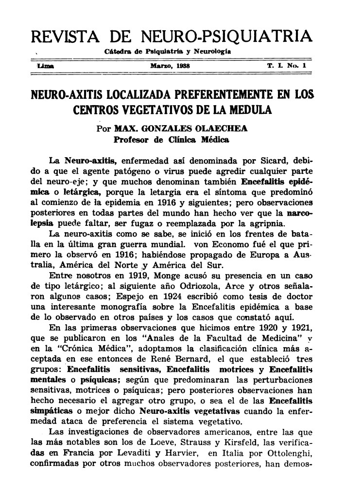 | Reseña | La Revista de Neuro-psiquiatría comenzó a publicarse en marzo de 1938, dirigida por los doctores Honorio Delgado y Julio Óscar Trelles. Funcionó como órgano de difusión de los trabajos de la Sociedad de Neuro-Psiquiatría y Medicina Legal, fundada ese mismo año, así como también los de la Cátedra de Psiquiatría y Neurología de la Facultad de Medicina de la Universidad Nacional Mayor de San Marcos (Mariátegui, 1997, p. 143). Es la revista científica más importante en el rubro de la salud mental que actualmente se publica en el Perú. La circunstancia que decidió la fundación de la Revista de Neuro-psiquiatría fue la elección de Lima como sede de la Segunda Reunión de las Jornadas Neuro-Psiquiátricas Panamericanas, efectuada del 20 al 25 de marzo de 1939 (Mariátegui, 1987, pp. 1-2). Dicho evento resaltó la importancia de la publicación de revistas especializadas en psiquiatría y neurología, que permitan el debate científico y la difusión de sus resultados. Fue, en términos generales, una prolongación de la Revista de Psiquiatría y Disciplinas Conexas, que había empezado a publicarse en 1918 y dejado de hacerlo en 1924. Honorio Delgado, fundador de esta última junto a Hermilio Valdizán, vio la ocasión de continuar el antiguo proyecto que generara con su maestro, a través de una nueva publicación periódica. Asimismo, la revista tiene el gran mérito de ser la más antigua y regular de las publicaciones psiquiátricas latinoamericanas (Mariátegui, 2000, p. 150). En su interior, se encuentran artículos originales plenos de calidad y rigurosidad científica, que exhiben los principales trabajos clínicos de las escuelas peruanas de psiquiatría y neurología, así como colaboraciones del exterior y una activa sección de recensiones o reseñas de libros y revistas. Aunque no fue el órgano oficial de la Sociedad de Neuro-Psiquiatría, publicó la transcripción de los resúmenes y crónicas de sus actividades científicas, tales como congresos, conferencias y demás exposiciones de tipo clínico, patológico y terapéutico de las especialidades a cargo de sus destacados miembros. Se convirtió en la expresión documentada de los desarrollos de la neurología, la psiquiatría, la neurocirugía y disciplinas afines en el Perú, adaptándose a los cambios propios de la metodología de la investigación, al tiempo que recogió lo más relevante y significativo de las mencionadas disciplinas. La crisis institucional que sufrió la Facultad de Medicina San Fernando a inicios de la década del 60 del siglo pasado, que tuvo como consecuencia la renuncia masiva de sus más insignes catedráticos, repercutió en la administración orgánica de la revista. Con el pasar de los años pero de manera ininterrumpida, se publicó primero con un régimen autónomo, bajo la dirección de los facultativos fundadores y el mismo cuerpo de redacción, y desde el 2008 pasó a la custodia y dirección de la hoy denominada Universidad Peruana Cayetano Heredia, patrocinada por la Facultad de Medicina “Alberto Hurtado” y la Cátedra “Honorio Delgado”. Allí asumiría después la dirección de la revista –compartida por un tiempo con Luis Trelles Montero, neurólogo e hijo de Don Julio Óscar— el brillante y fecundo psiquiatra Javier Mariátegui, quien, dotado de una cultura universal de múltiples facetas, siendo un notable académico de la medicina, de la historia y de la lengua, continuaría por la misma senda trazada por sus antecesores, con el mismo rigor académico y admirable ímpetu, llegando a consolidar una etapa de intensa conexión de la revista con la psiquiatría y neurología latinoamericana y europea (Alva, 2015, pp. 107-108). Referencias bibliográficas: Alva, A. (2015). La Revista de Neuro-psiquiatría: reflexiones sobre sus fundadores, sus “laboratorios” y su historia institucional. Revista de Neuro-psiquiatría, 78(2):102-109. Mariátegui, J. (1987). El cincuentenario de la Revista de Neuro-psiquiatría. Revista de Neuro-psiquiatría, 50(1):1-3. Mariátegui, J. (1997). Seguín y la historia societaria de la psiquiatría en el Perú. Revista de Neuro-psiquiatría, 60(2), 141-144. Mariátegui, J. (2000). Prensa psiquiátrica latinoamericana. Revista de Neuro-psiquiatría, 63(3-4):138-152. |
