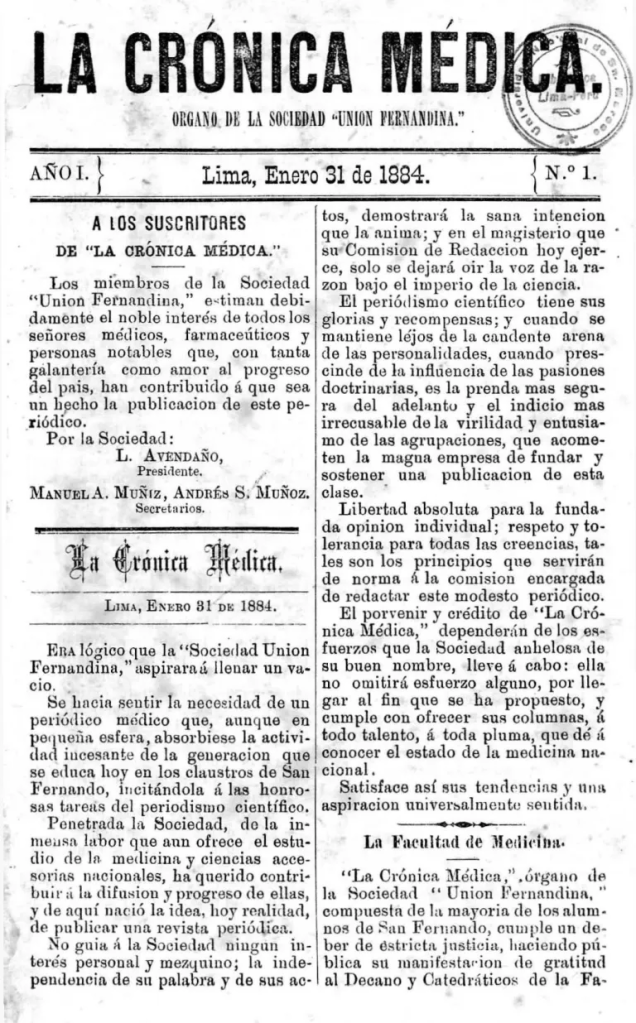 Otro hito en la prensa médica peruana se desarrolló a partir de 1884, cuando la Sociedad Médica Unión Fernandina, creada un año antes por estudiantes de la Facultad de Medicina de San Marcos, inició la edición de su vocero oficial: La Crónica Médica (Lima, 1884-1963). Es considerada como una de las revistas médicas más importantes en la historia de la medicina peruana. Sus paginas difundieron aspectos de educación, investigación y práctica médica y farmacéutica, promocionando el mejoramiento de la salud pública. Además, la revista incluyó las actas y documentos de la Sociedad, así como información oficial de la facultad. En sus primeros años, La Crónica Médica contó con la contribución de Leónidas Avendaño Ureta, quien fue el primer presidente de la Unión Fernandina, junto a figuras destacadas como Ulloa, David Matto, José A. de los Ríos, Francisco Almenara Butler, Pablo Patrón, Ignacio de la Puente, Federico Remy, entre otros.