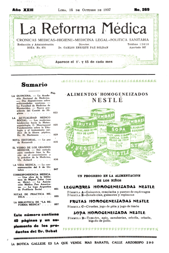 En el rubro de la medicina social destacó Medicina Social (Lima, 1937, 1944-[1955]). En el Perú, la medicina social fue una propuesta impulsada por Carlos Enrique Paz Soldán desde la década de 1910 y aterrizada desde la creación del Instituto de Medicina Social en 1927. Para Paz Soldán (1927, p. xv), “[…] La Medicina Social es, por definición, el estudio de la población humana en función de los ambientes geo-cósmico y social, para conocer las acciones y reacciones mutuas de modo de fijar las leyes de la salud y de la prosperidad biosocial del hombre”.