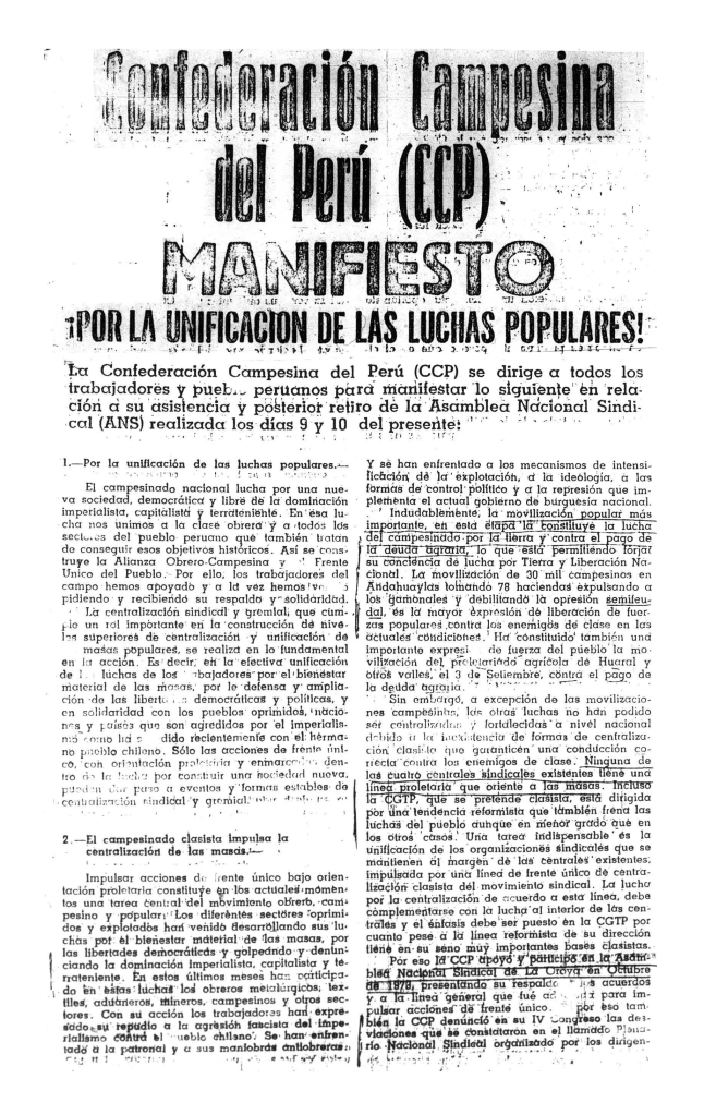 El material compartido aquí proporciona una oportunidad invaluable para adentrarse en la historia de una de las centrales gremiales más prominentes del país. A través de estos recursos, no solo se puede profundizar en la historia sindical y del movimiento social en el Perú, sino también en la historia agraria y campesina del país. La CCP mantuvo estrechos vínculos con diversas organizaciones sociales y partidos políticos que surgieron dentro de su seno, incluyendo el Partido Comunista del Perú, Vanguardia Revolucionaria, y el Partido Unificado Mariateguista, entre otros. La documentación relacionada con estos grupos y sus líderes está disponible en el archivo.