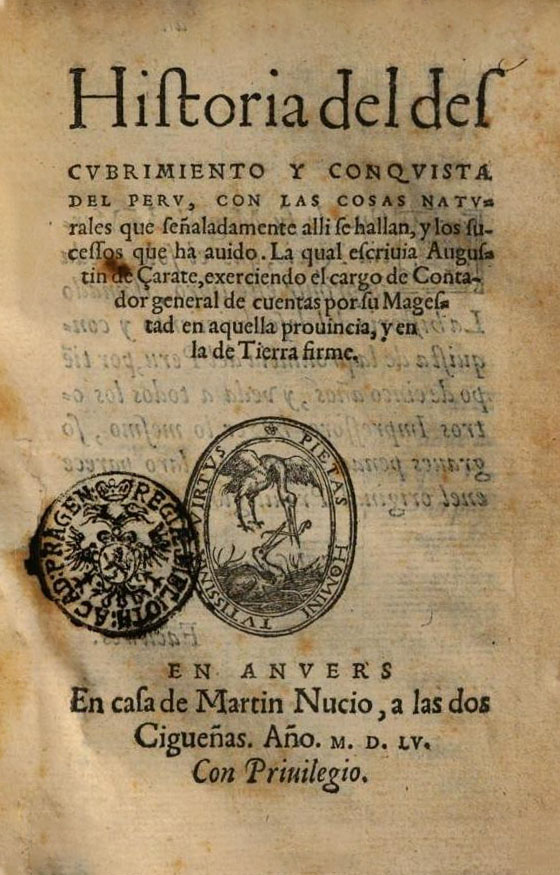 Zárate, A. de (1555). Historia del Descubrimiento y Conquista del Perú, con las cosas naturales que señaladamente allí se hallan, y los sucessos que ha habido. Amberes: Casa de Martin Nucio.