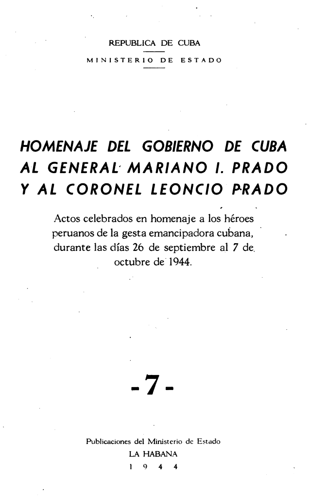 Ministerio de Estado (1944). Homenaje del gobierno de Cuba al general Mariano I. Prado y al coronel Leoncio Prado. La Habana: Publicaciones del Ministerio de Estado.