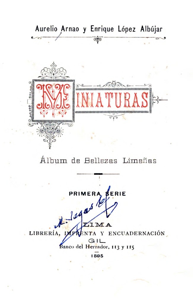 Arnao, A. y López Albújar, E. (1895). Miniaturas: Álbum de bellezas limeñas. Lima: Librería, Imprenta y Encuadernación Gil.