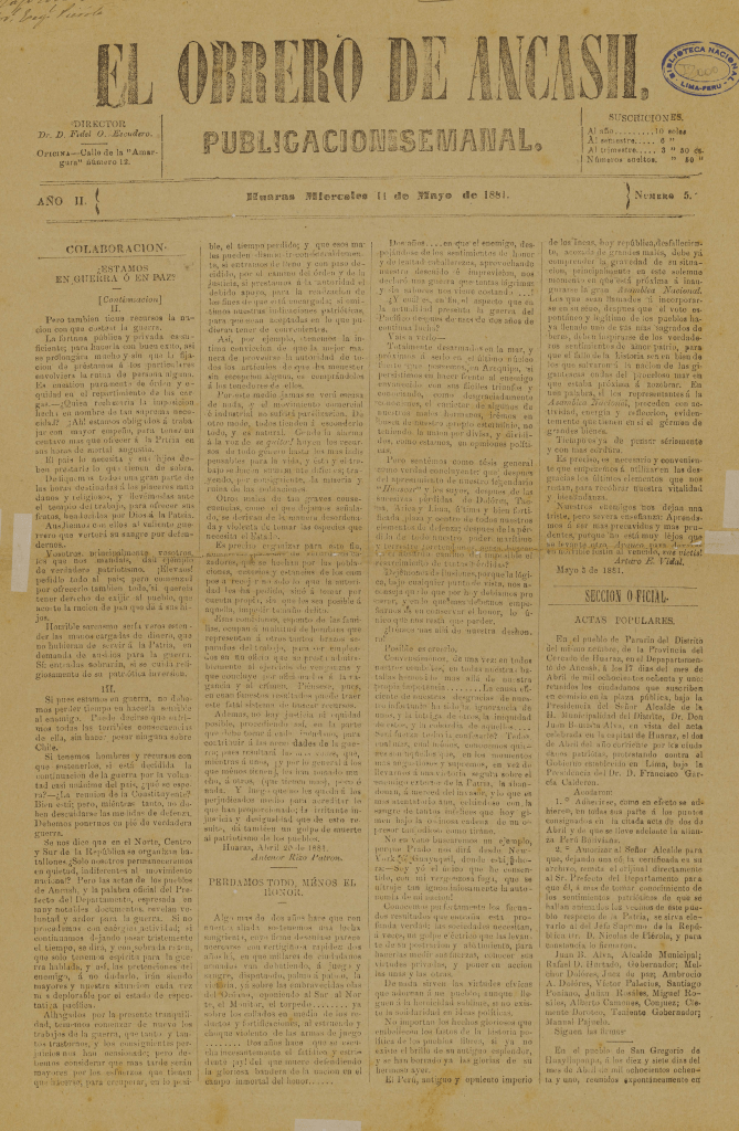 Publicación semanal editada en Huaraz al menos durante los años 1880 y 1881, en pleno desarrollo de la guerra del Pacífico. Bajo la dirección de Fidel O. Escudero, la revista fue impresa en la Imprenta del Colegio de la Libertad, primero administrada por Julián Montoro y posteriormente por Aguedo Melgarejo. A lo largo de sus ediciones, esta publicación abordó los acontecimientos más relevantes del conflicto bélico, incluyendo la correspondencia entre Francisco García Calderón y Lizardo Montero, así como informes sobre la participación de la región de Áncash en la guerra. Además, en sus páginas se difundieron proclamas enérgicas contra el gobierno provisorio de García Calderón en Lima, al cual se acusaba de traición por su aparente cercanía al gobierno chileno, proclamando a Nicolás de Piérola como la única autoridad legítima. El semanario también dedicó espacio a informaciones locales, crónicas religiosas y artículos científicos, como uno centrado en el estudio del ácido sulfúrico, demostrando así un interés por un amplio espectro de temas, tanto regionales como nacionales.