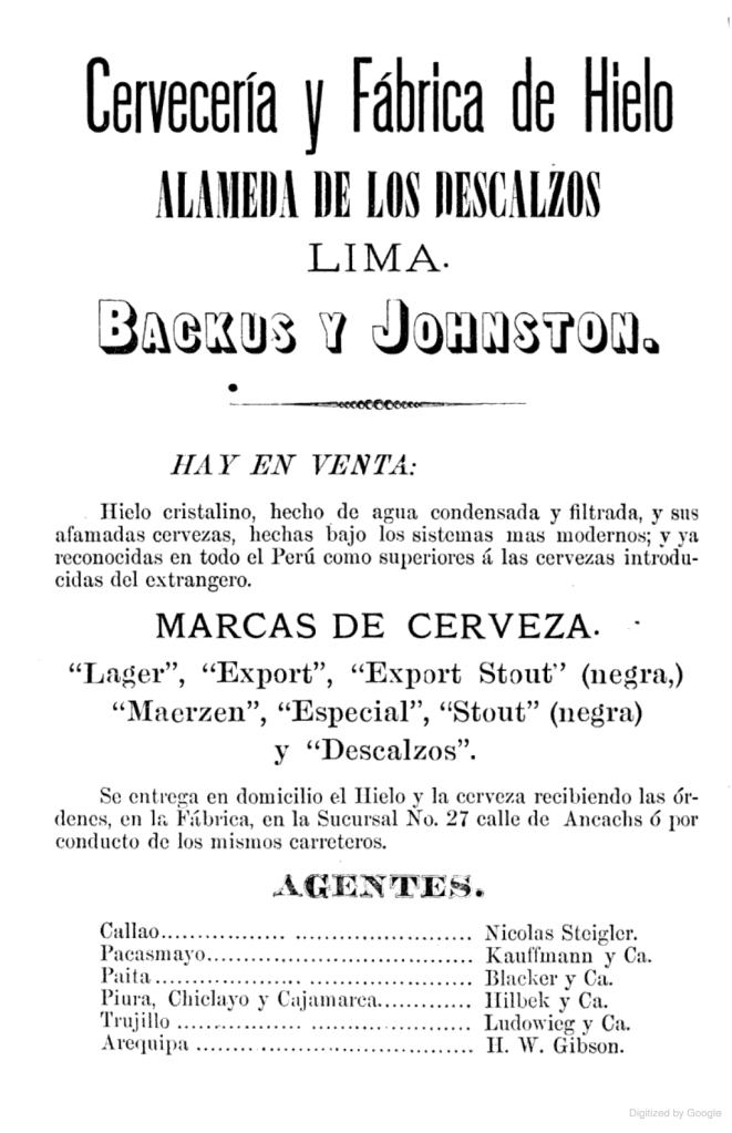 - El Perú Ilustrado (1887). Fábrica Sud-Americana de Hielo y Cerveza: Backus y Johnston-Lima. El Perú Ilustrado, 1(1), 5.