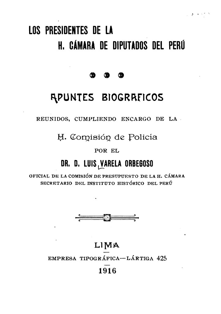Varela Orbegoso, L. (1916). Los presidentes de la H. Cámara de Diputados del Perú: Apuntes biográficos. Lima: Empresa Tipográfica.