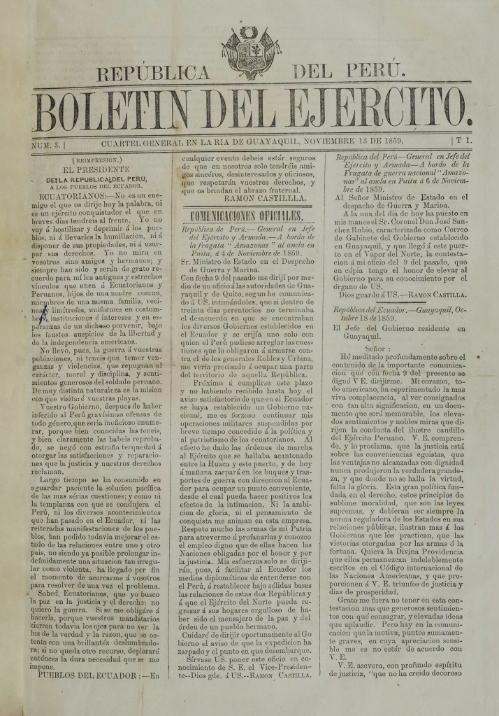 El Boletín del Ejército fue una publicación itinerante del Ejército Peruano editada bajo el auspicio del presidente Ramón Castilla durante la campaña militar en el contexto del conflicto político entre Perú y Ecuador (1858-1860). Este boletín se imprimió en diversos cuarteles generales establecidos a lo largo del recorrido de la fragata de guerra Amazonas, que trasladaba al presidente Castilla rumbo a Guayaquil para participar en las negociaciones. El conflicto se originó por la entrega, por parte del gobierno ecuatoriano, de territorios que, según la Real Cédula de 1802, pertenecían al Perú. Estos territorios fueron cedidos a acreedores ingleses como parte de pago de una deuda externa ecuatoriana, lo que provocó una seria tensión entre ambos países.