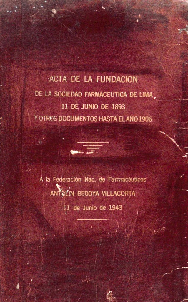 Bedoya Villacorta, A. (recop.) (1943). Acta de Fundación de la Sociedad Farmacéutica de Lima, 11 de junio de 1893, y otros documentos hasta el año 1906 [Manuscrito]. Colección Particular de Juan Medina Landeo (Lima, Perú).